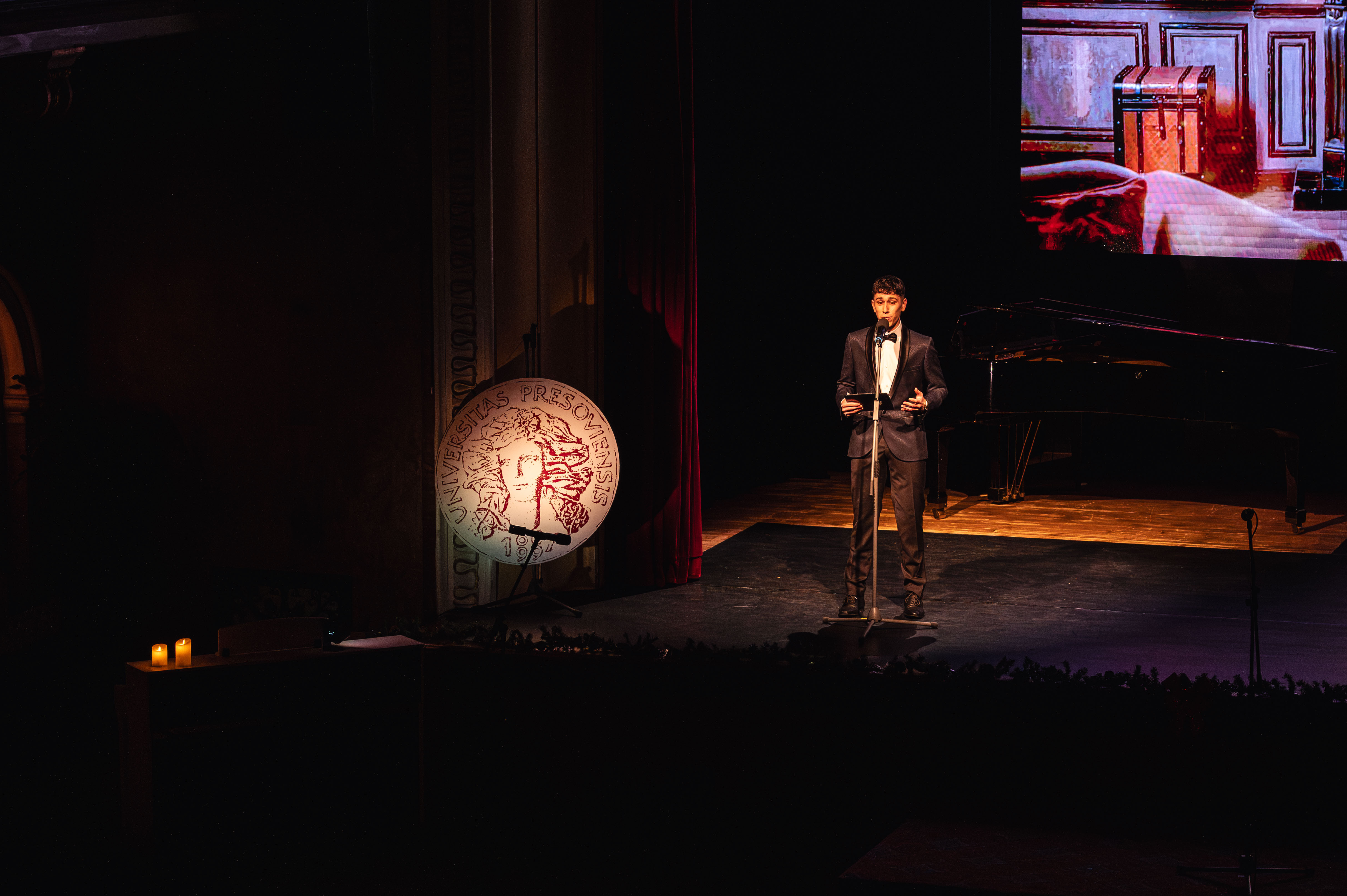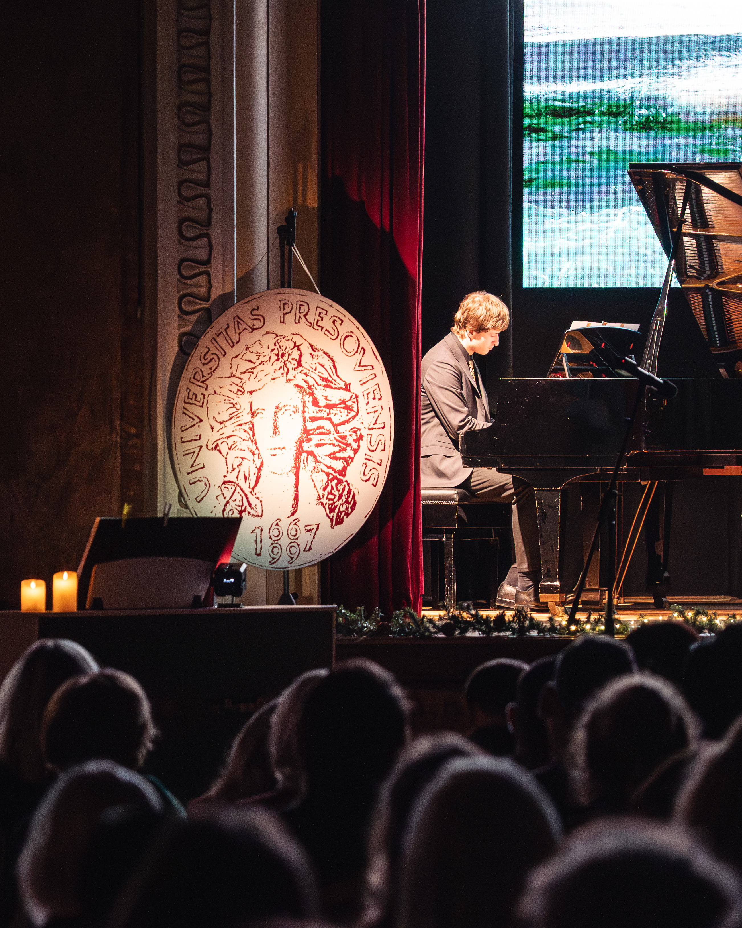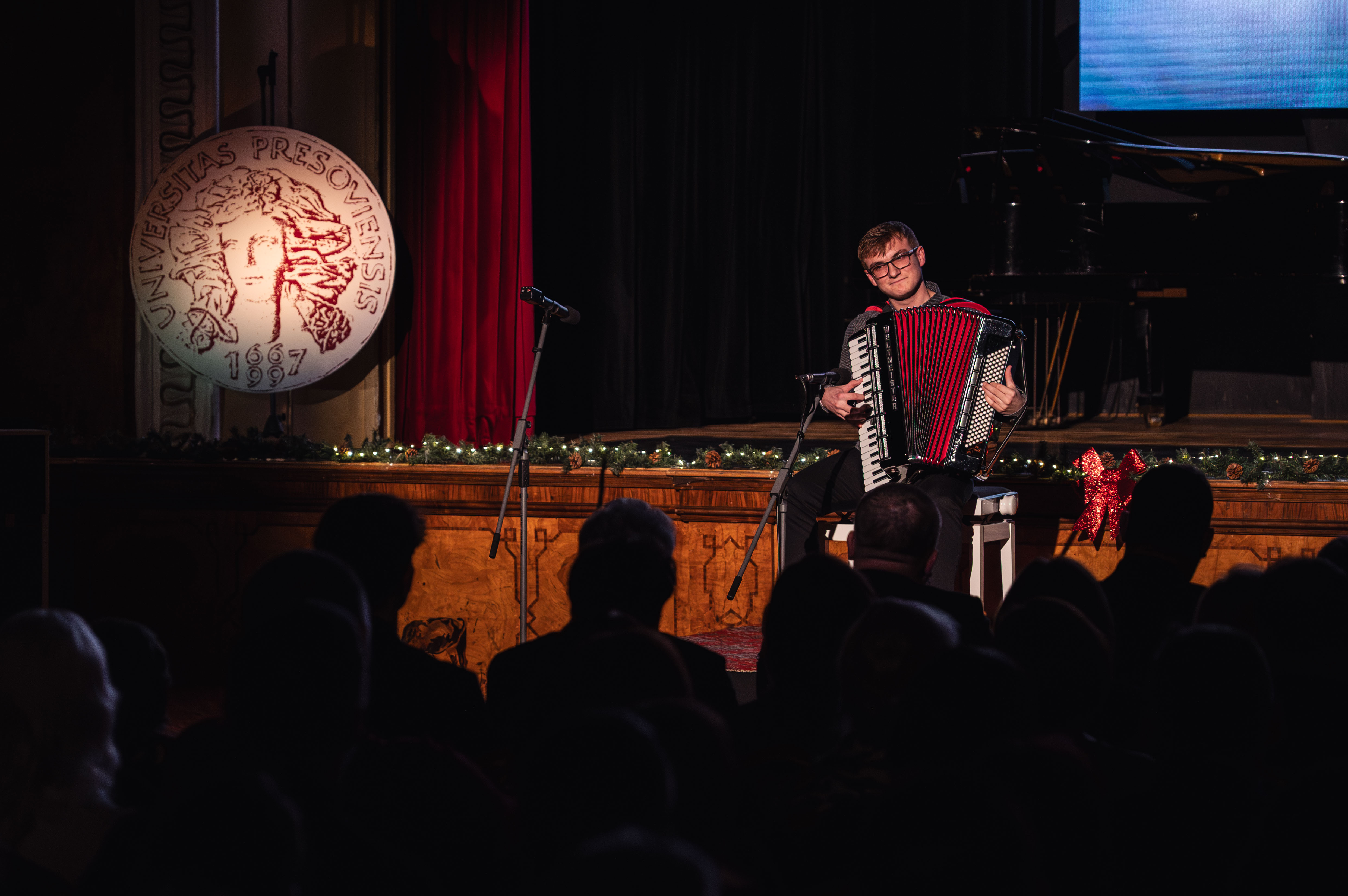 Rektor univerzity prof. Peter Kónya vo svojom úvodnom príhovore privítal hostí a vyjadril presvedčenie, že koncert prinesie publiku oddych od predvianočného zhonu a navodí sviatočnú atmosféru.