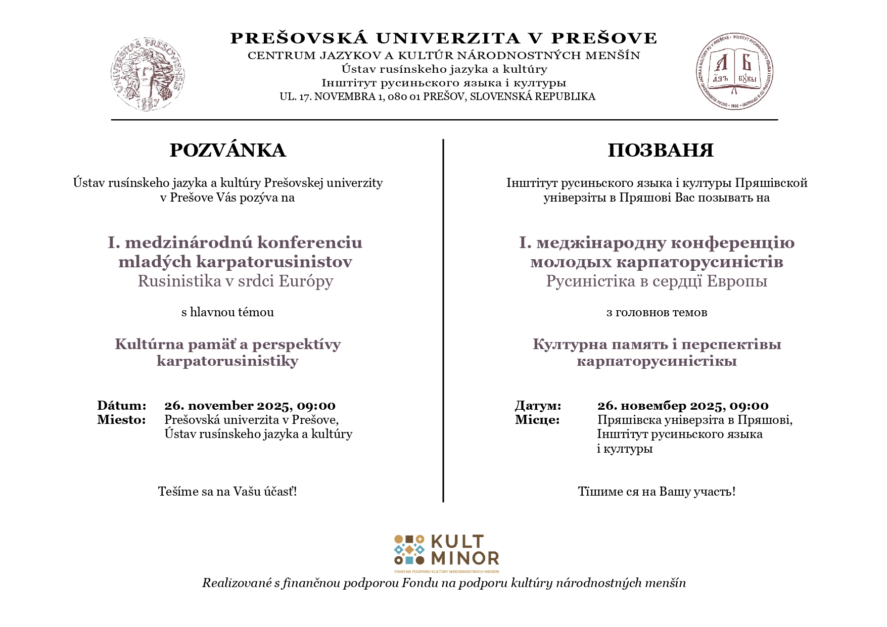 I. medzinárodná konferencia mladých karpatorusinistov, 26. november 2025 Galéria Galéria Dokumenty Dokumenty Pozvánka Program SVK Program RUE Aktualizoval(a): Michal Pavlič , 25.11.2025