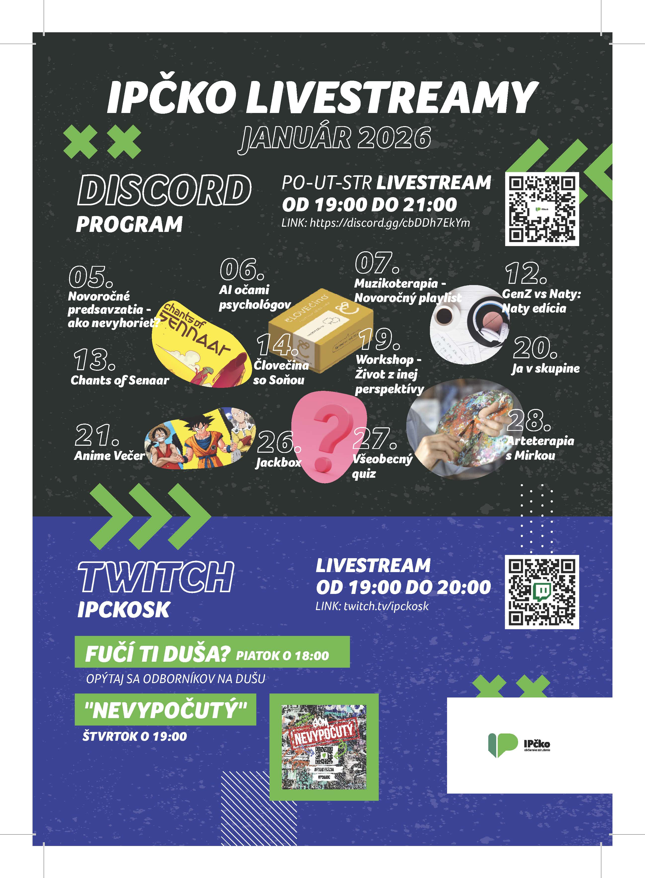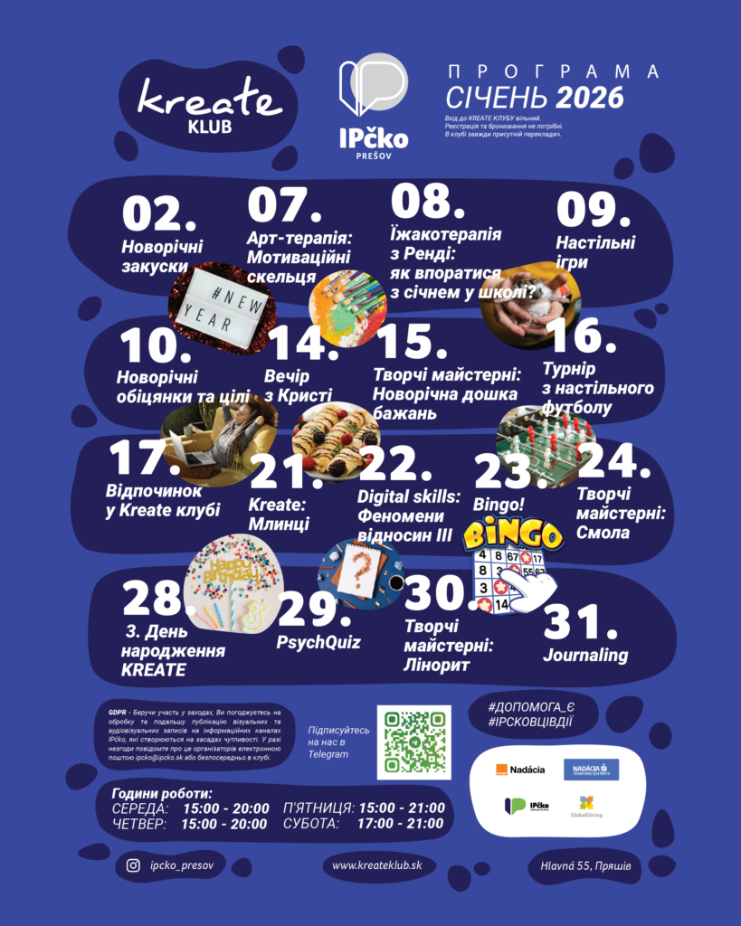 Káčko Prešov (Kreate klub), Hlavná 55 – program január 2026
