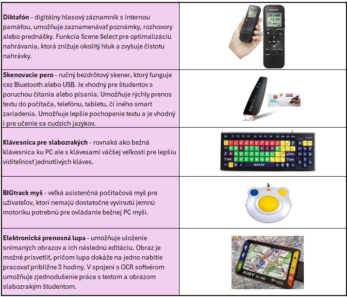 V Centre podpory študentov PU ponúkame pre študentov rôzne podporné technológie a pomôcky. Niektoré z nich je možné si na určitú dobu aj zapožičať. Bližšie informácie k jednotlivým pomôckam získate priamo u nás v Centre.
