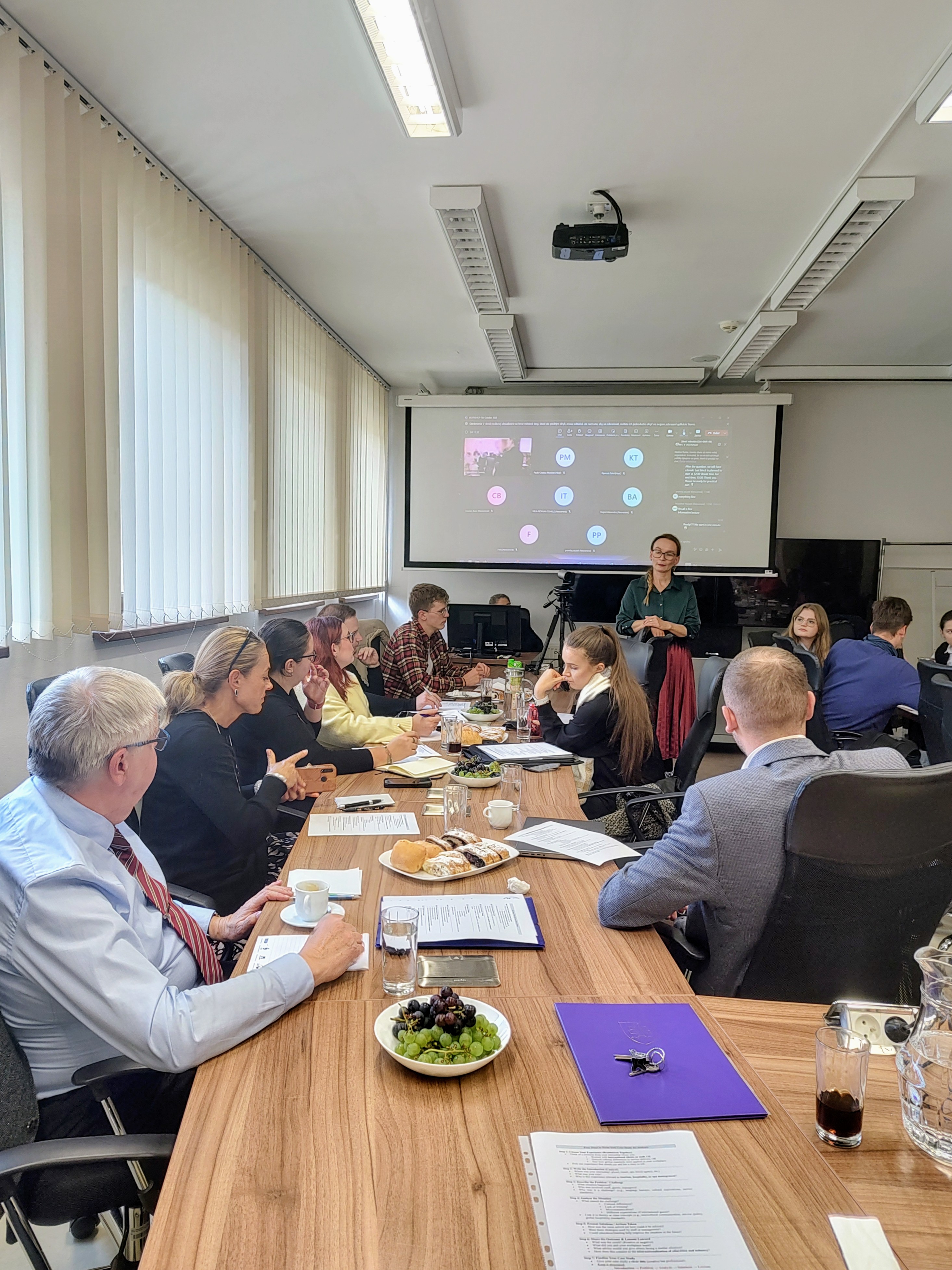 The main activity of the project’s first year was an international workshop held on October 7, 2025, at the Faculty of Management and Business. In the Faculty’s Scientific Council meeting room, members of the project team from the Department of Tourism and Hotel Management met with students of the bachelor’s program Tourism, Hotel and Spa Industry and the master’s program Management. Distinguished guests from abroad also attended, including Dr. Maria Hadjielia Drotarova, PhD., Head of Research at CTL Eurocollege Limassol, Cyprus, and Dr. Petr Houška, PhD. from PAN-EUROPEAN University in Prague. Additional participants from partner universities in Cyprus and Romania joined the meeting online. The entire event was conducted in English.