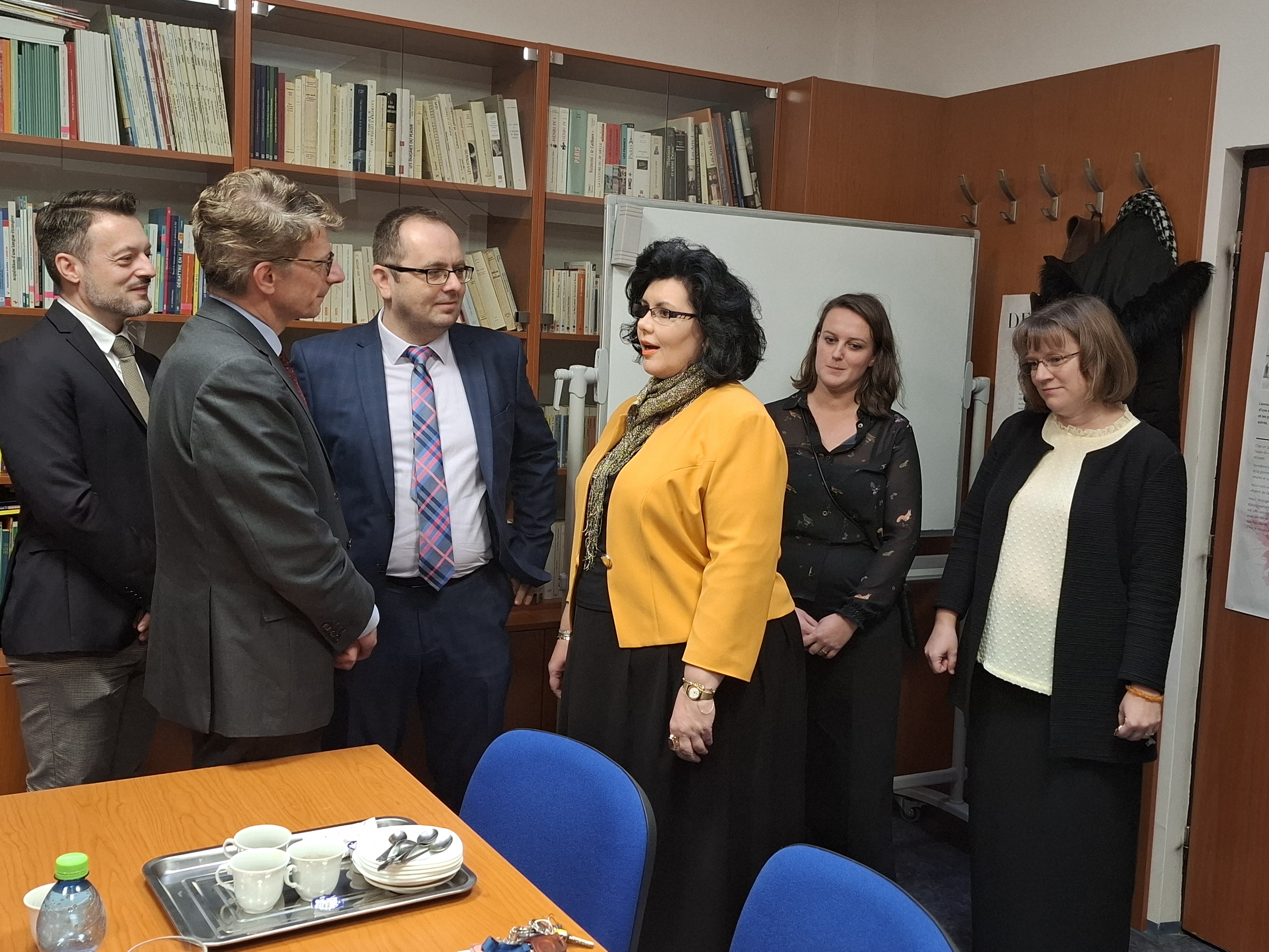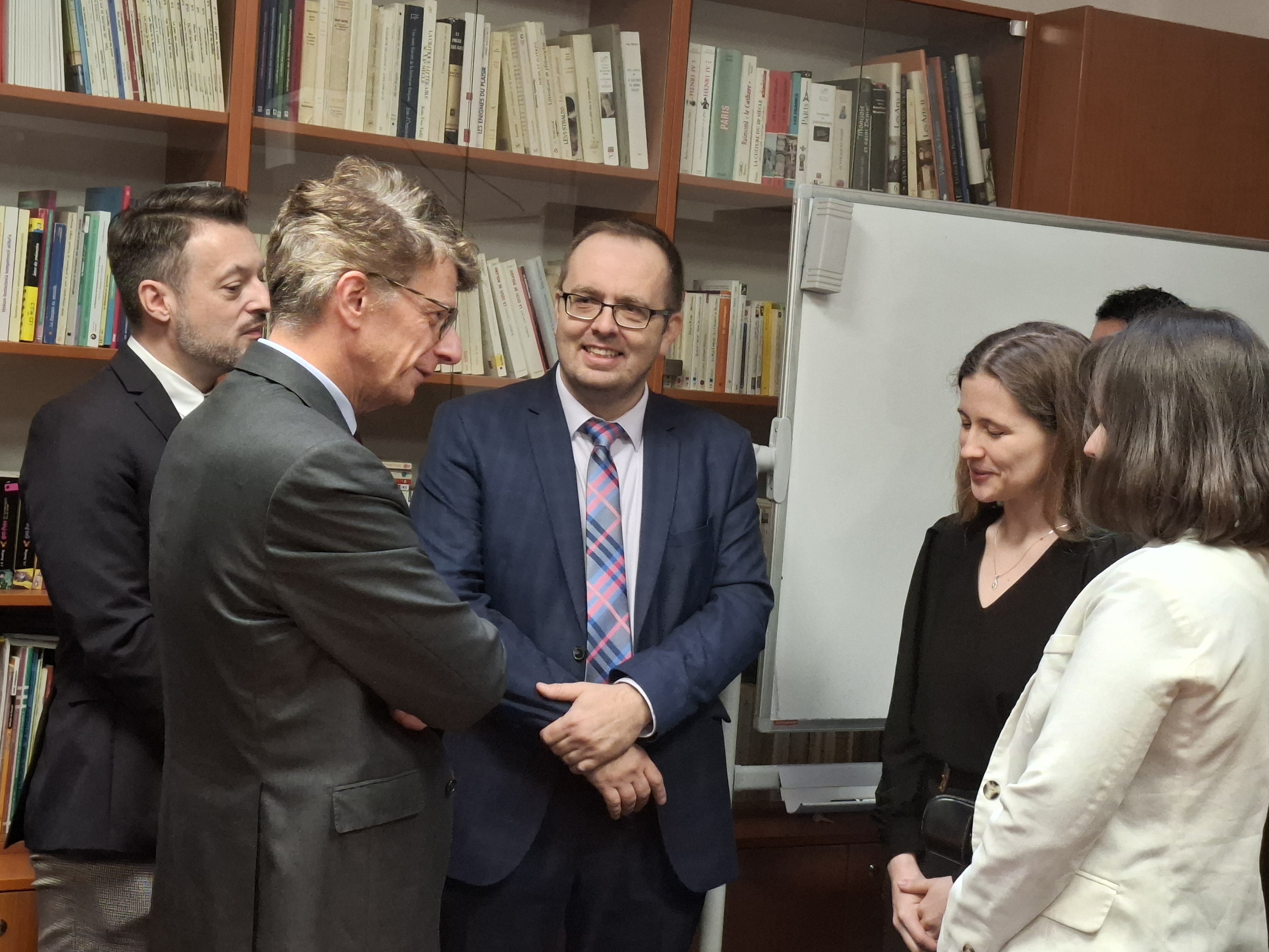 The delegation was first received by the university management, Rector Dr.h.c. prof. PhDr. Peter Kóny, PhD., followed by a short visit to the Welcome Office. At the Faculty of Arts, the ambassador met with the dean, Prof. PhDr. Beáta Balogová, PhD., and representatives of the Institute of German and Romance Studies (IGAR), where they discussed the development of cooperation between the French Alliance and IGAR and the possibilities for further cooperation with France.