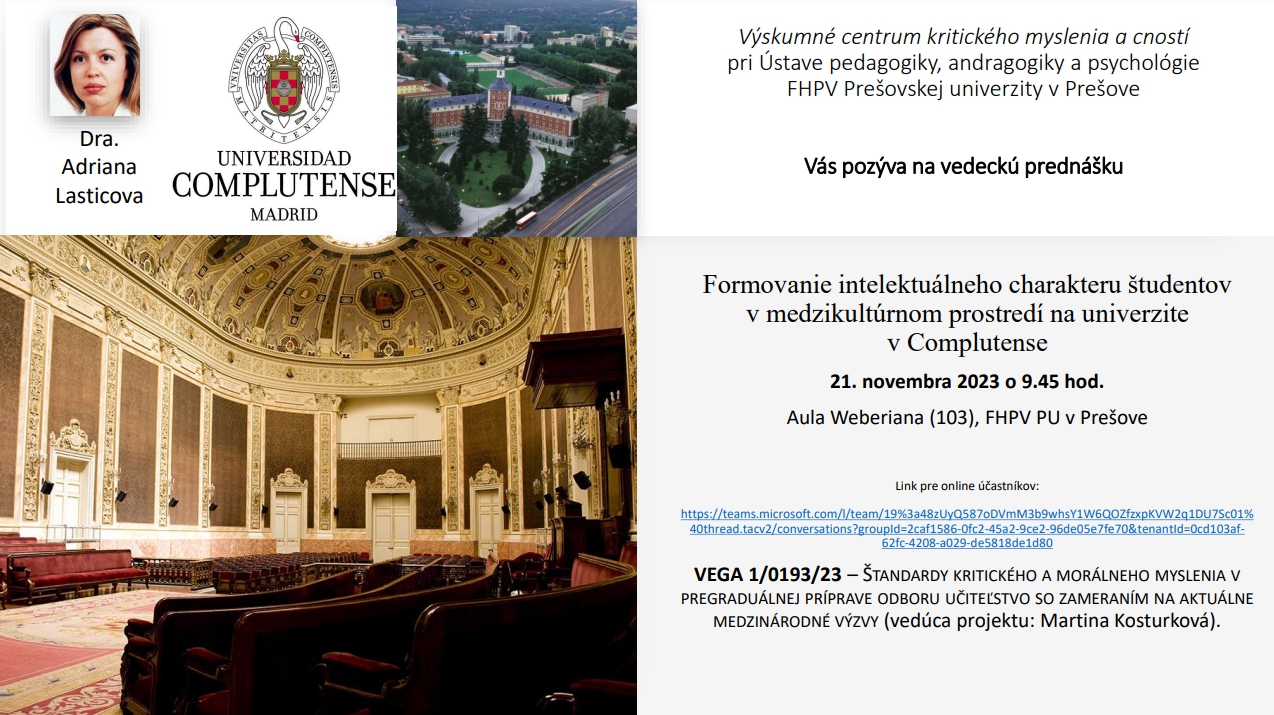 Výskumné centrum kritického myslenia a cností  pri Ústave pedagogiky, andragogiky a psychológie FHPV Prešovskej univerzity v Prešove Vás pozýva na vedeckú prednášku