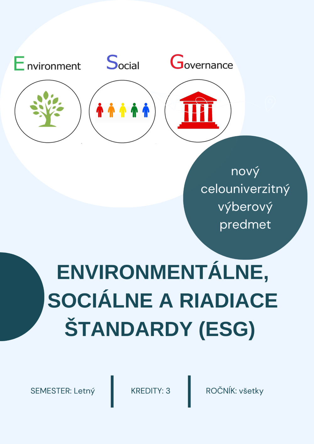 V najbližších rokoch budú môcť spoločnosti čerpať finančné prostriedky na investície do udržateľnosti, ekológie a digitalizácie. Stratégia ESG je preto dnes pre podniky veľmi aktuálna. Z legislatívy EU zároveň vyplýva, že podniky budú nevyhnutne potrebovať špecialistov na oblasť ESG. My chceme týmto predmetom reagovať na nastupujúci trend.