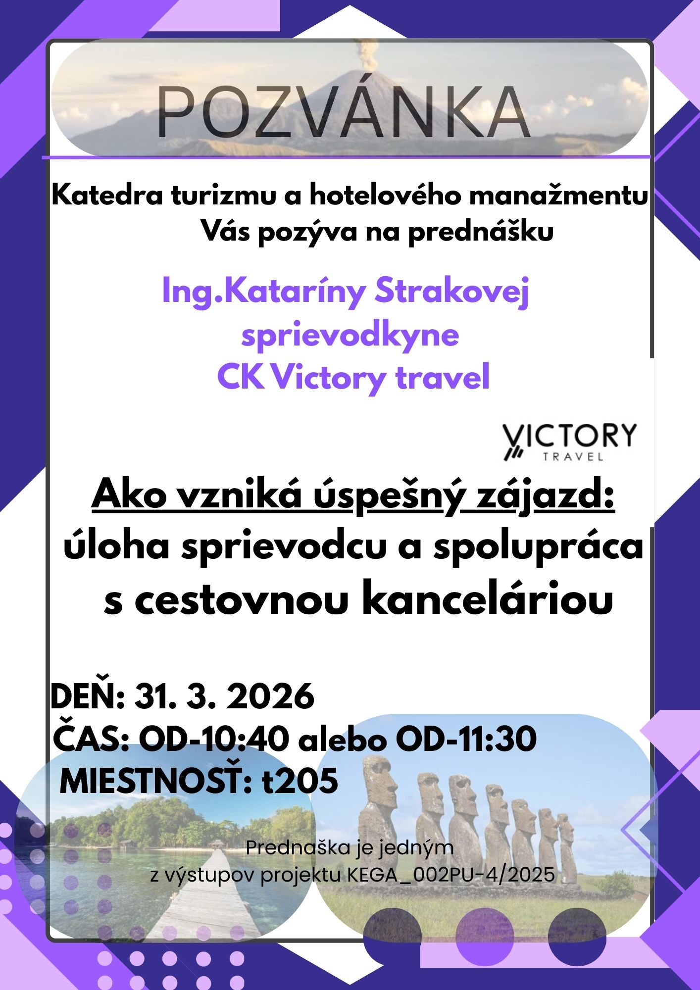 Katedra turizmu a hotelového manažmentu v rámci predmetu Cestovné kancelárie a cestovné agentúry organizuje odbornú prednášku z praxe v spolupráci s Ing. Katarínou Strakovou, ktorá pôsobí ako sprievodca CK Victory Travel.