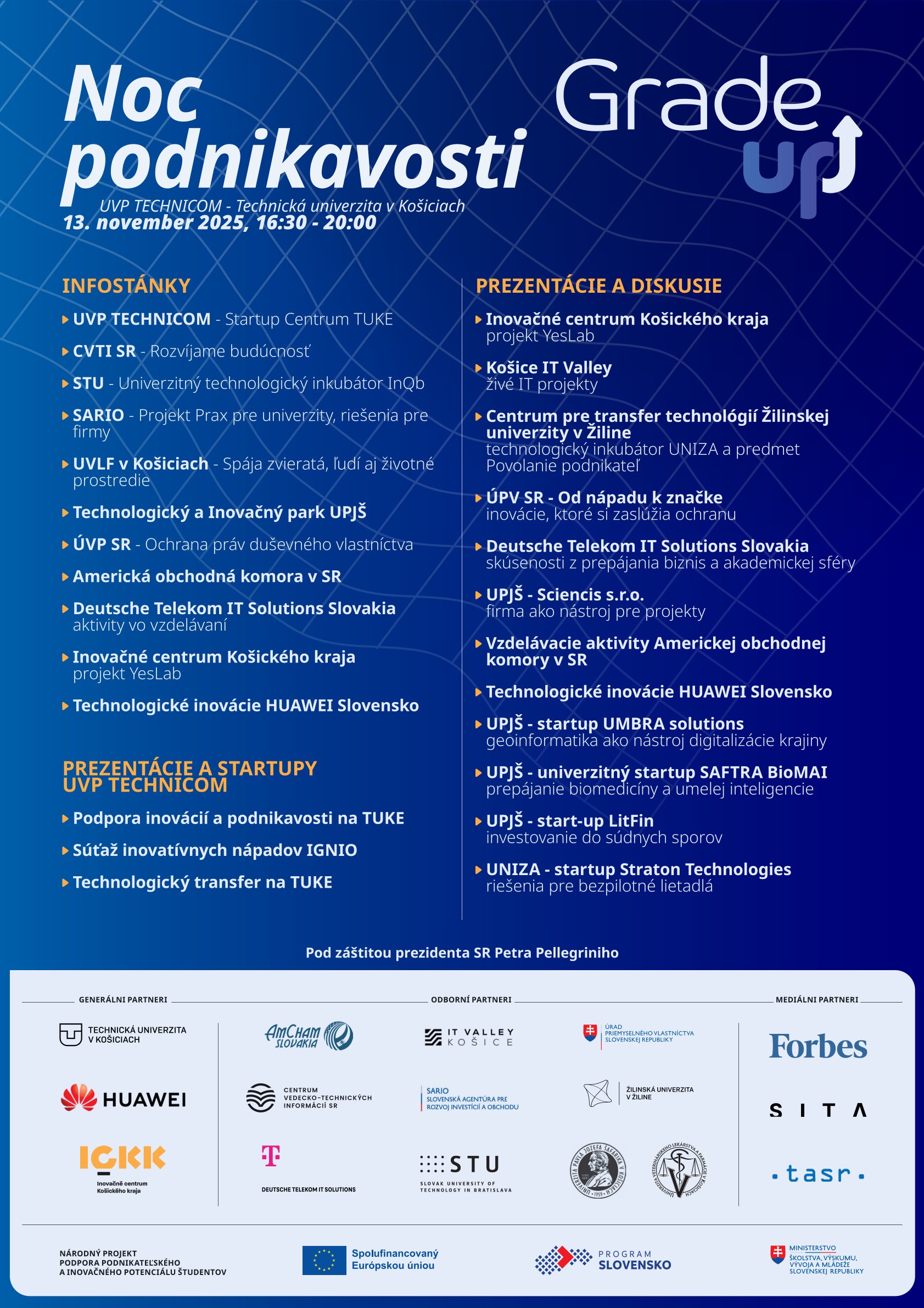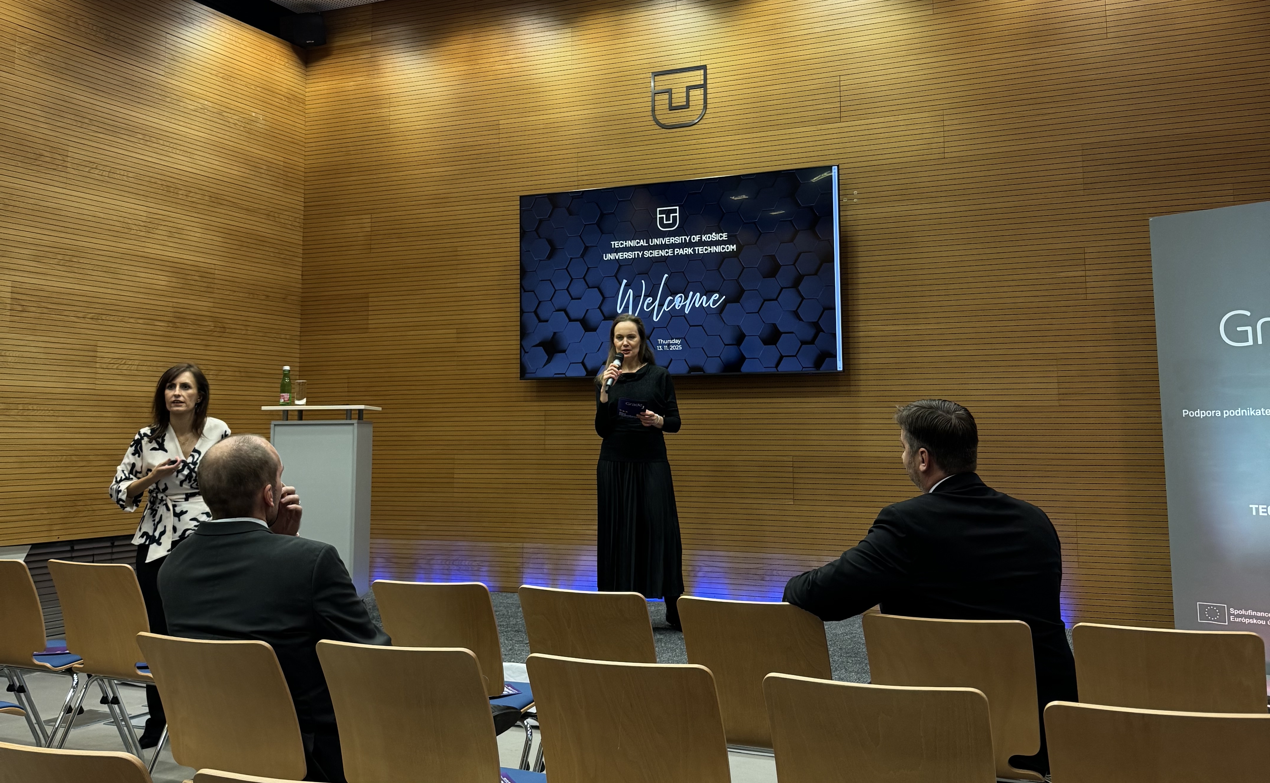 Dňa 13. novembra 2025 v priestoroch Technickej univerzity v Košiciach a Univerzitného vedeckého parku TECHNICOM sa členovia KFUMM a zároveň členovia riešiteľského tímu projektov KEGA 001PU-4/2025 alebo KEGA 014PU-4/2024, doc. Ing. Sylvia Jenčová, PhD., doc. Ing. Beáta Šofranková, PhD., Ing. Jaroslav Korečko, PhD., Ing. Ján Vravec, PhD., Mgr. Martina Košíková, PhD., Mgr. Marta Miškufová, PhD. a Mgr. Kateryna Melnyk, zúčastnili konferencie GradeUp a podujatia Noc podnikavosti, ktoré organizovalo Ministerstvo školstva, výskumu, vývoja a mládeže SR pri príležitosti oficiálneho predstavenia národného projektu Podpora podnikateľského a inovačného potenciálu študentov, ktorého zámerom je podpora inovovania študijných programov verejných vysokých škôl zameraných na zvyšovanie podnikateľského a inovačného potenciálu študentov. Na konferencii v rámci panelových diskusií vystúpili predstavitelia vysokých škôl, štátnych inštitúcií, vedci, inovátori, ale aj štartujúci podnikatelia - startupisti a zástupcovia podnikateľskej sféry, ktorí spolupracujú s verejnými vysokými školami.