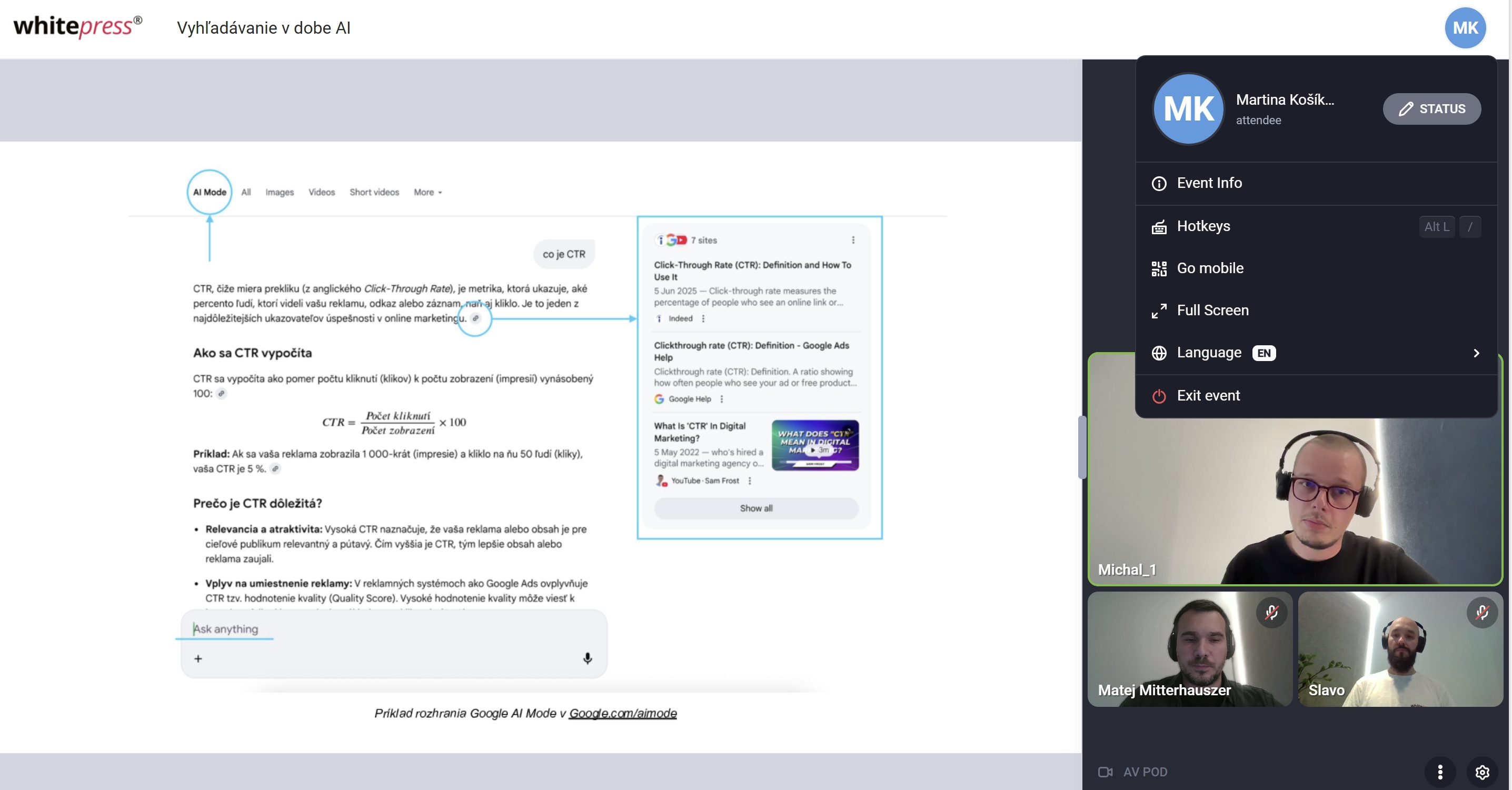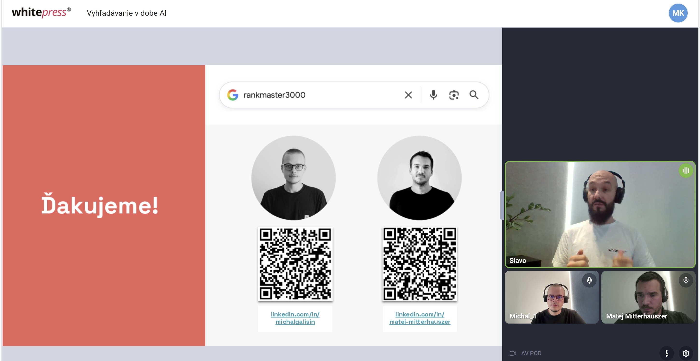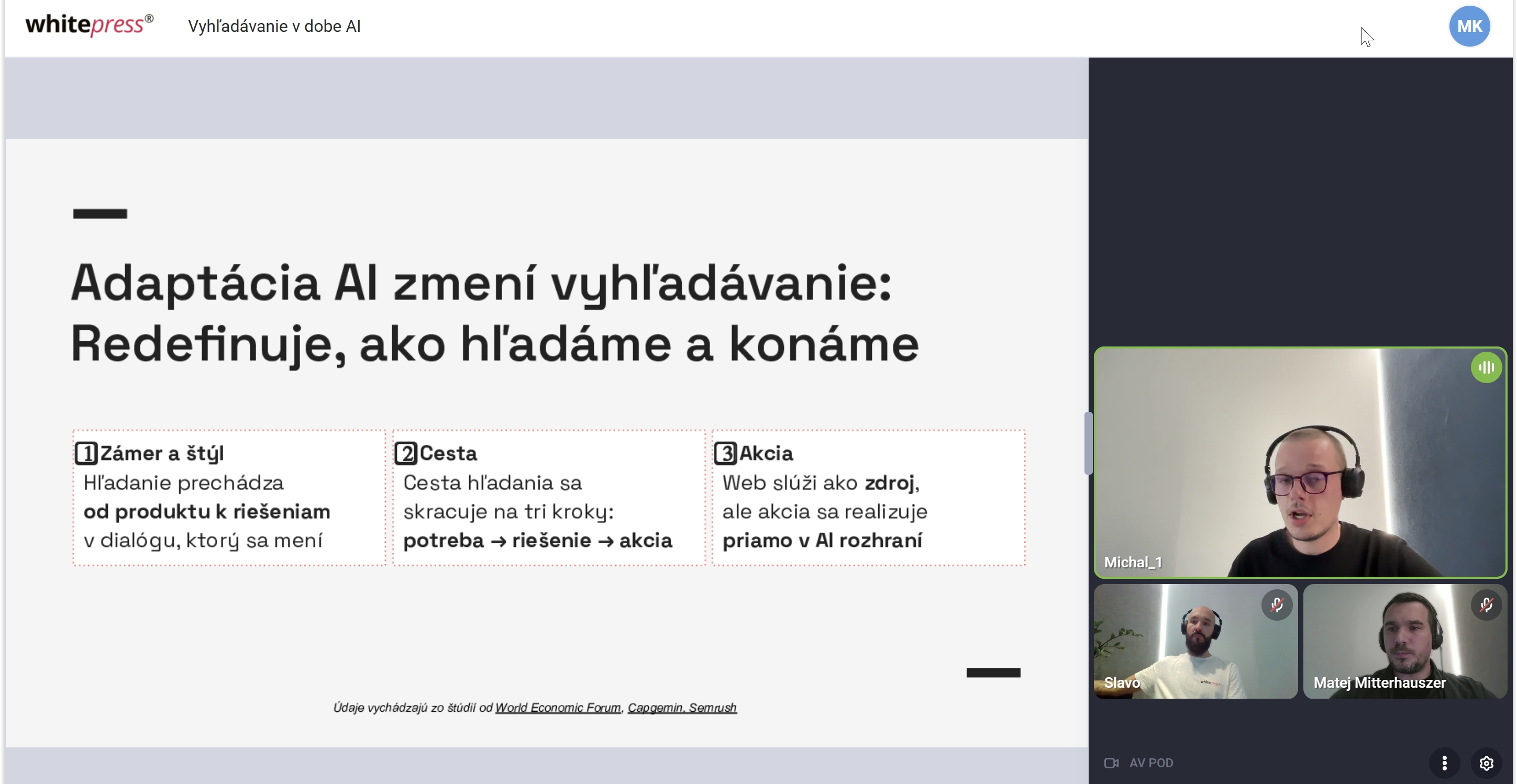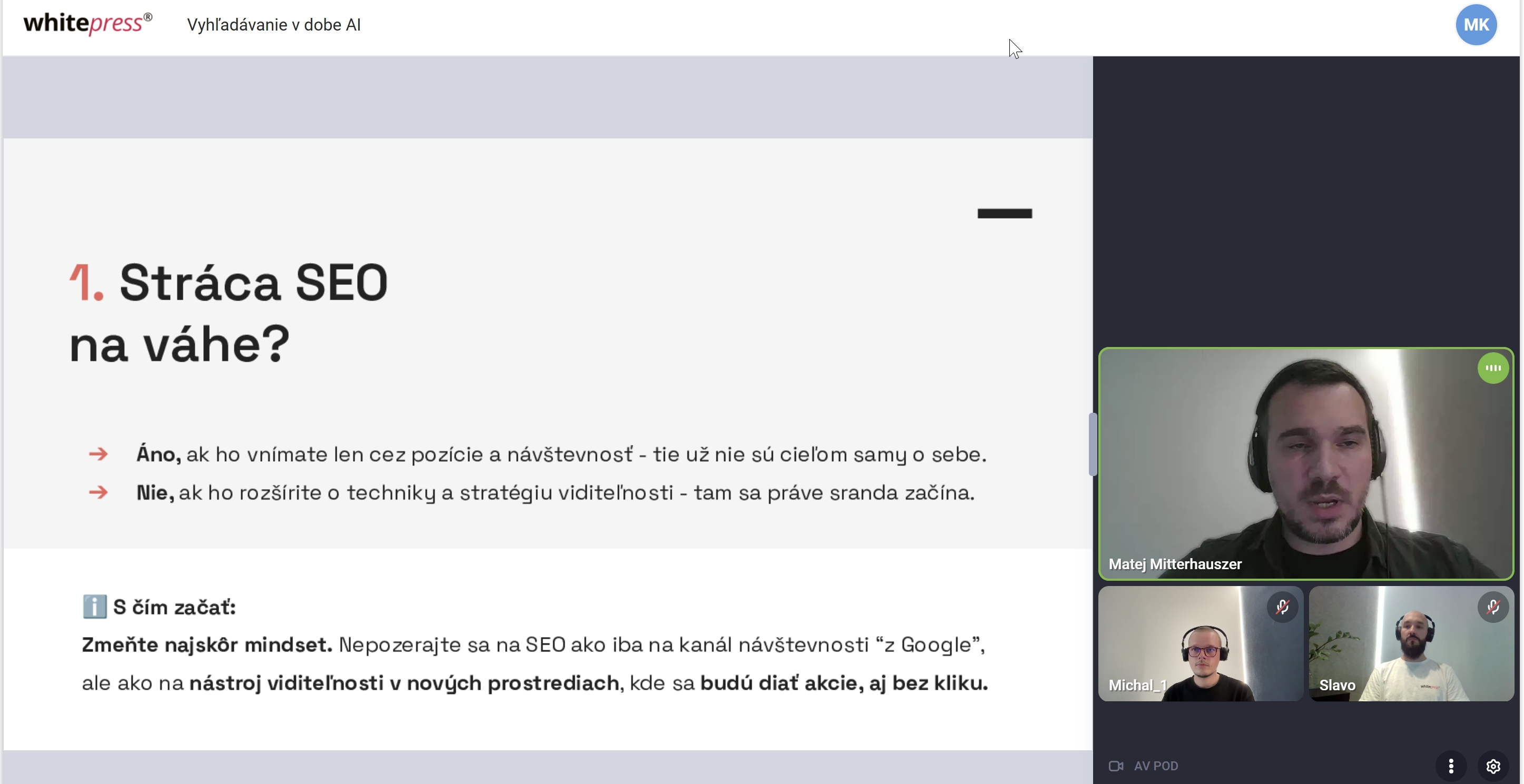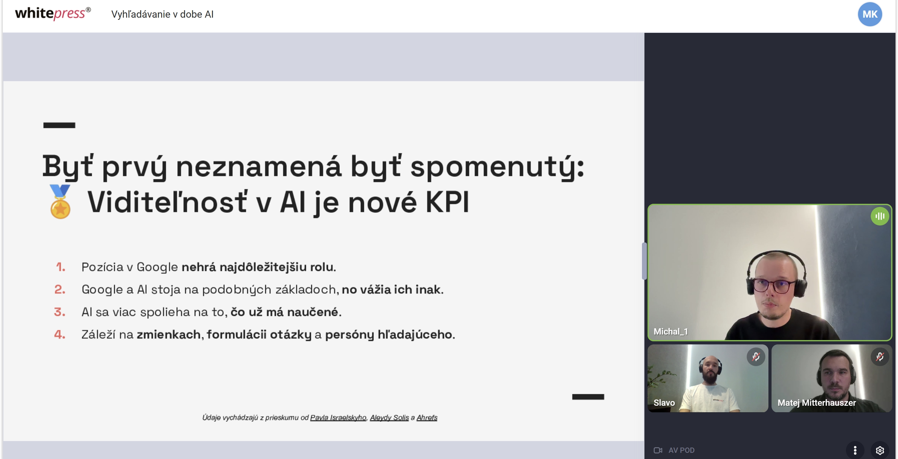 Prezentujúci odborníci Michal Gališin a Matej Mitterhauszer sa venovali zmenám vo vyhľadávaní spôsobeným zavádzaním umelej inteligencie do online prostredia (AI Overviews, AI Mode) a ich dopadu na SEO stratégie. Účastníci získali prehľad o výzvach, ktoré do budúcnosti prináša prepojenie AI a vyhľadávacích systémov, a mali možnosť pracovať s interaktívnym reportom návštevnosti AI v prostredí Looker Studio. Podujatie viedol Slavo Hyben, regionálny manažér WhitePress® SK&CZ. Súčasťou webinára bol priestor na diskusiu a zodpovedanie otázok k praktickému využitiu AI v marketingovej analytike.