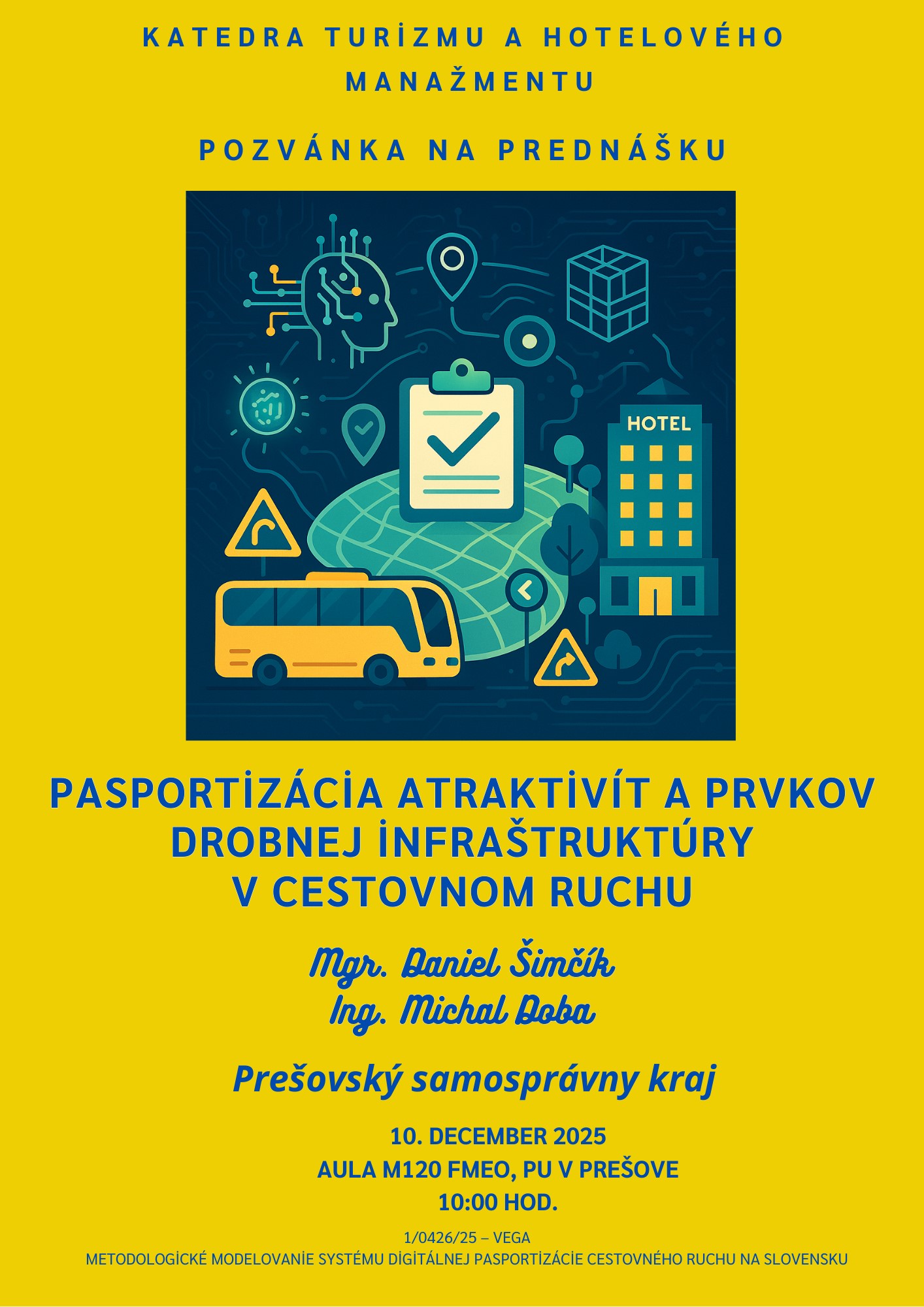 Dňa 10. decembra 2025 sa v rámci riešenia projektu 1/0426/25 – VEGA: Metodologické modelovanie systému digitálnej pasportizácie cestovného ruchu na Slovensku uskutočnila odborná prednáška zameraná na moderné trendy digitalizácie v cestovnom ruchu.