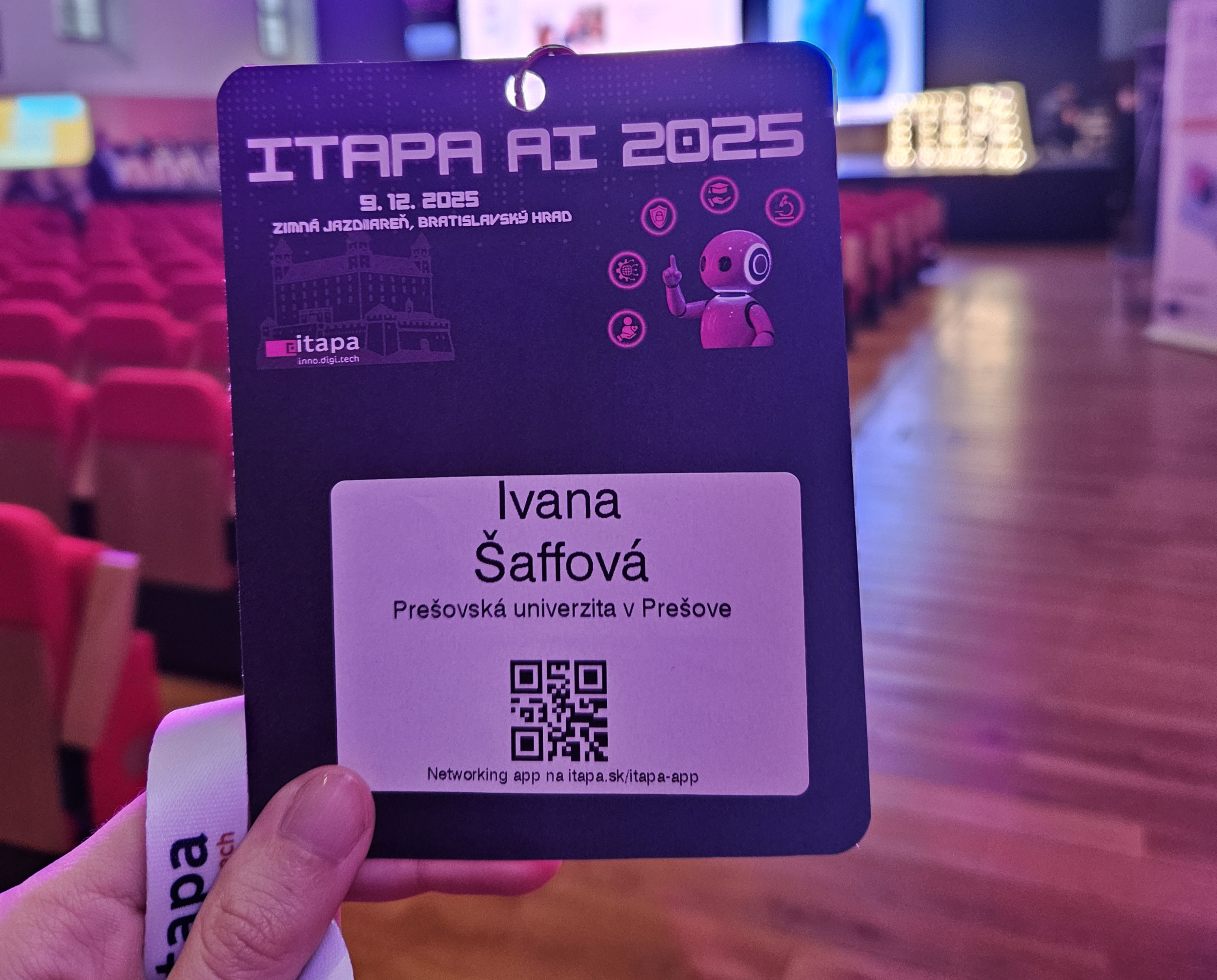 Dňa 9. decembra 2025 sa na Bratislavskom hrade konala prestížna technologická konferencia ITAPA AI 2025, ktorá priniesla množstvo inšpiratívnych diskusií, prezentácií a workshopov z oblasti umelej inteligencie. Udalosť sa konala v historickej Zimnej jazdiarni a jej hlavnou témou bolo využitie AI v štátnej správe, vzdelávaní, priemysle a výskume. Zastúpenie na tomto podujatí mala aj Prešovská univerzita v Prešove, ktorú v rámci riešenia projektu 1/0426/25 – VEGA: Metodologické modelovanie systému digitálnej pasportizácie cestovného ruchu na Slovensku, reprezentovala Mgr. Ivana Šaffová, MBA, MBE, interná doktorandka Katedry turizmu a hotelového manažmentu Fakulty manažmentu, ekonomiky a obchodu Prešovskej univerzity v Prešove (KTHM FMEO PU v Prešove).