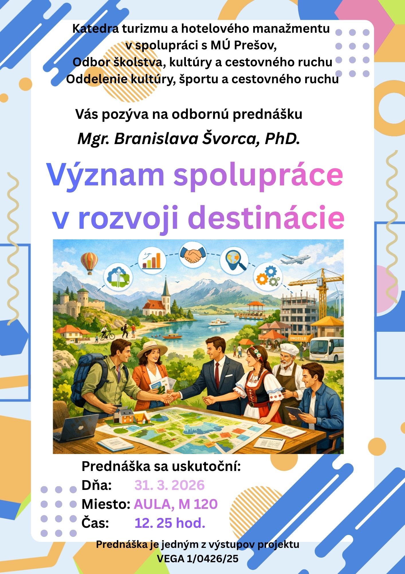 Katedra turizmu a hotelového manažmentu, FMEO, v spolupráci s Mestským úradom v Prešove, Odborom školstva, kultúry a cestovného ruchu Vás pozýva na odbornú prednášku Mgr. Branislava Švorca, PhD na tému