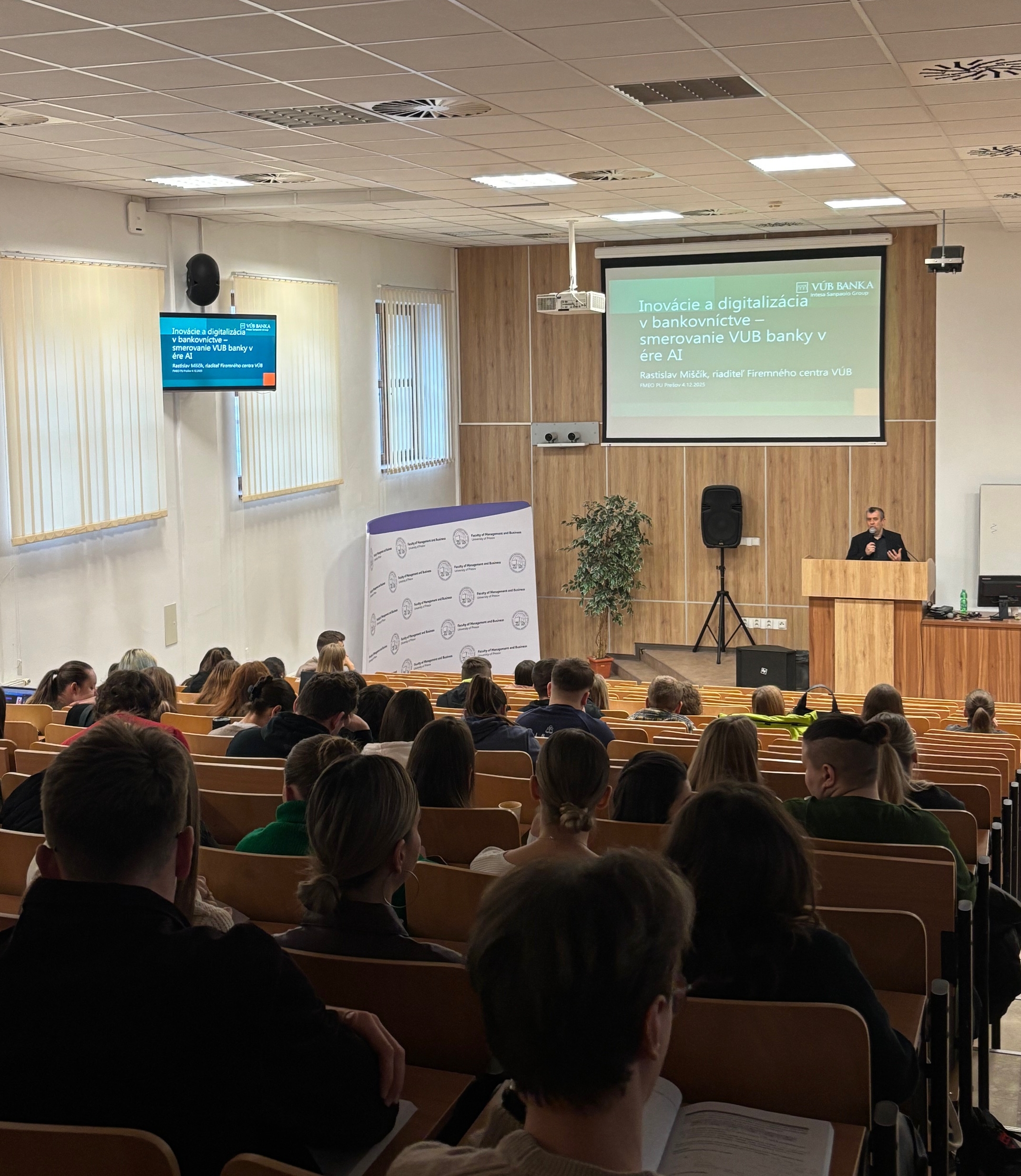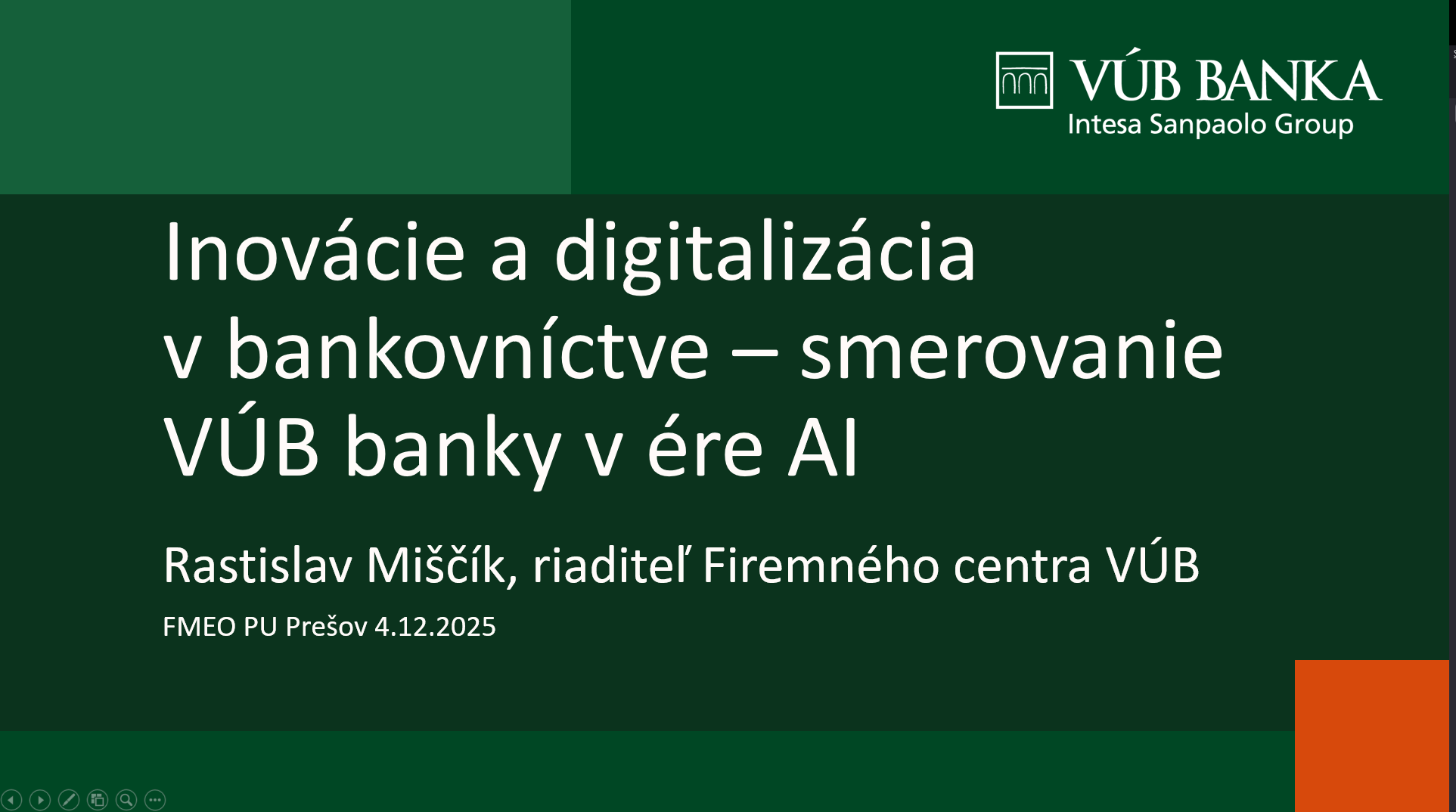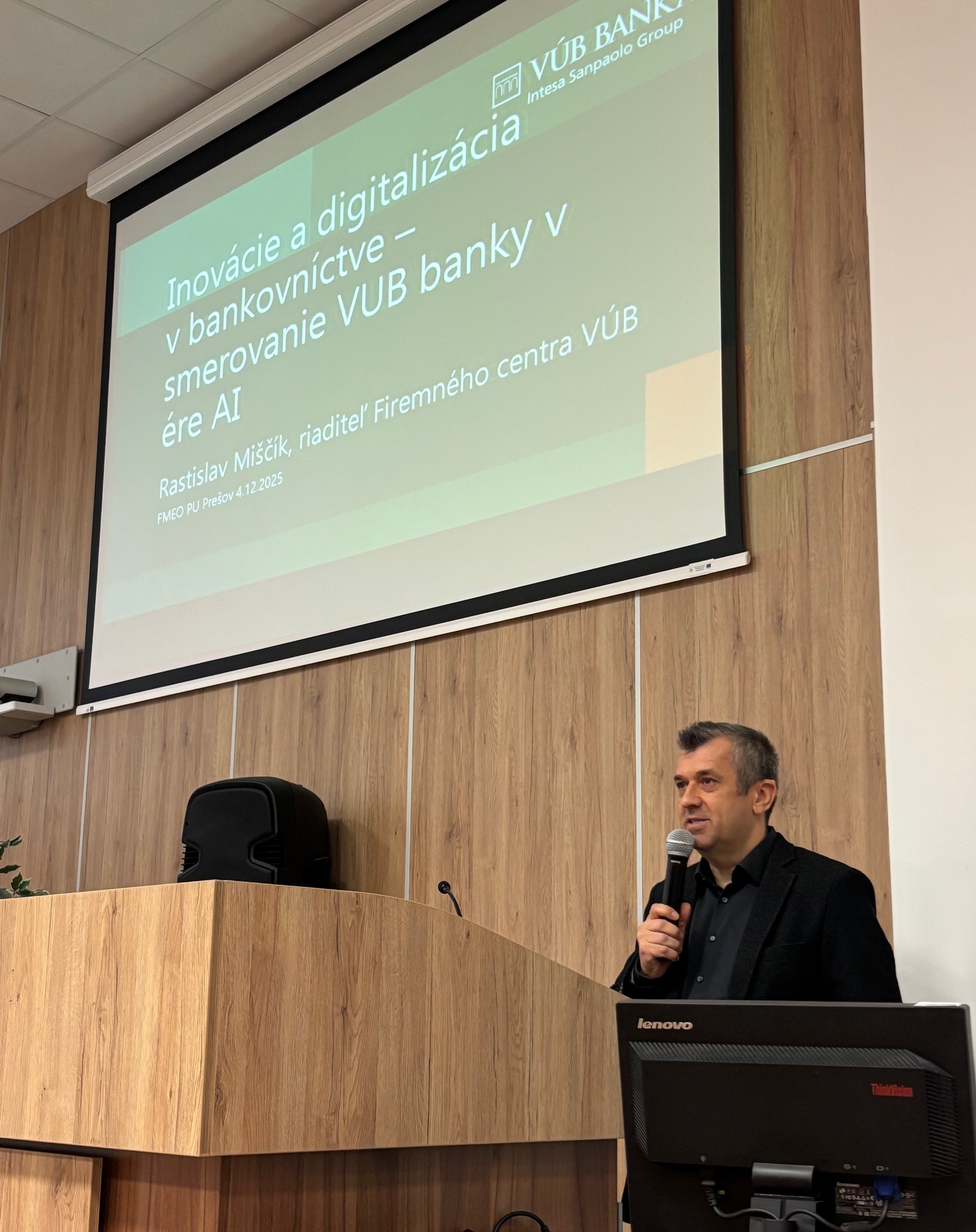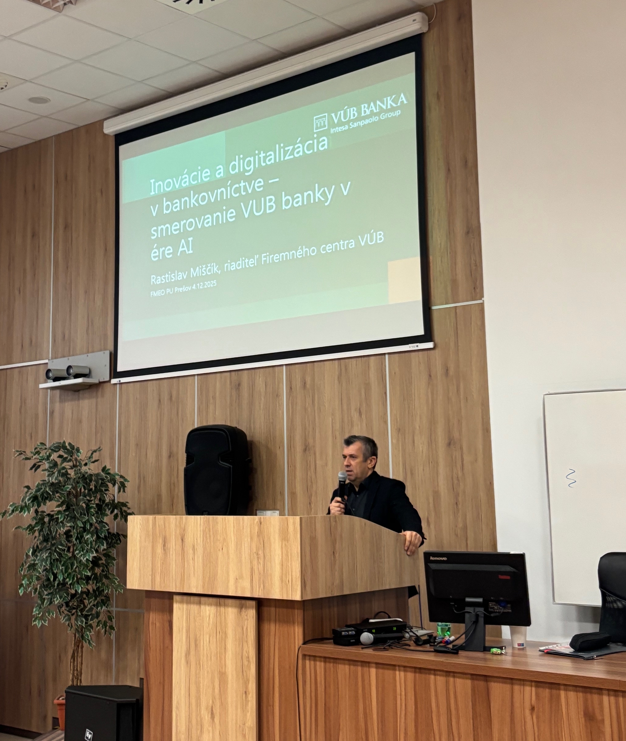 Dňa 4. decembra 2025 Katedra financií, účtovníctva a matematických metód v spolupráci uskutočnila pre študentov 1. ročníka magisterského štúdia v študijnom odbore ekonómia a manažment prednášku na tému "Inovácie a digitalizácia v bankovníctve - smerovanie VÚB banky v ére AI“. Prednášajúcim bol Ing. Rastislav Miščík (riaditeľ firemného centra pobočky VÚB v Košiciach).
