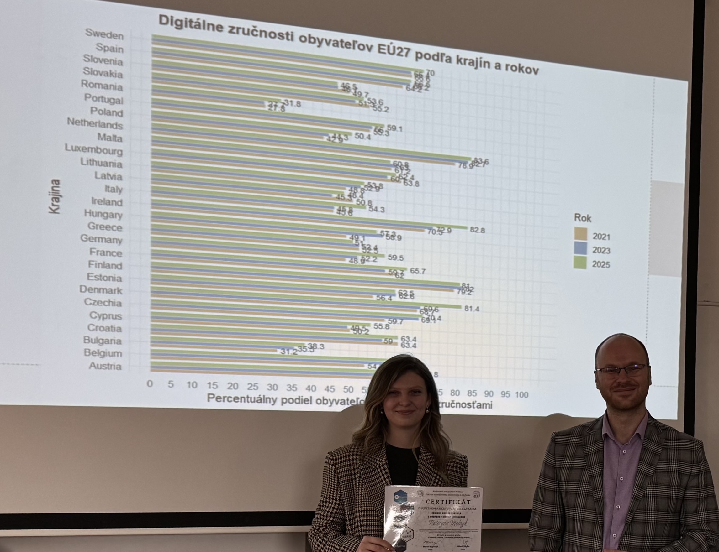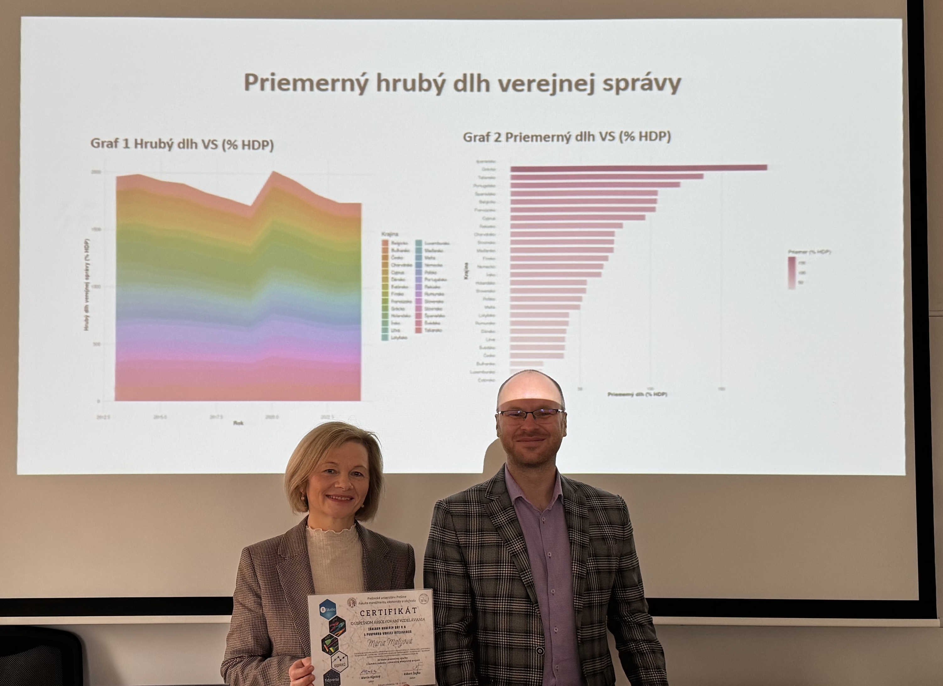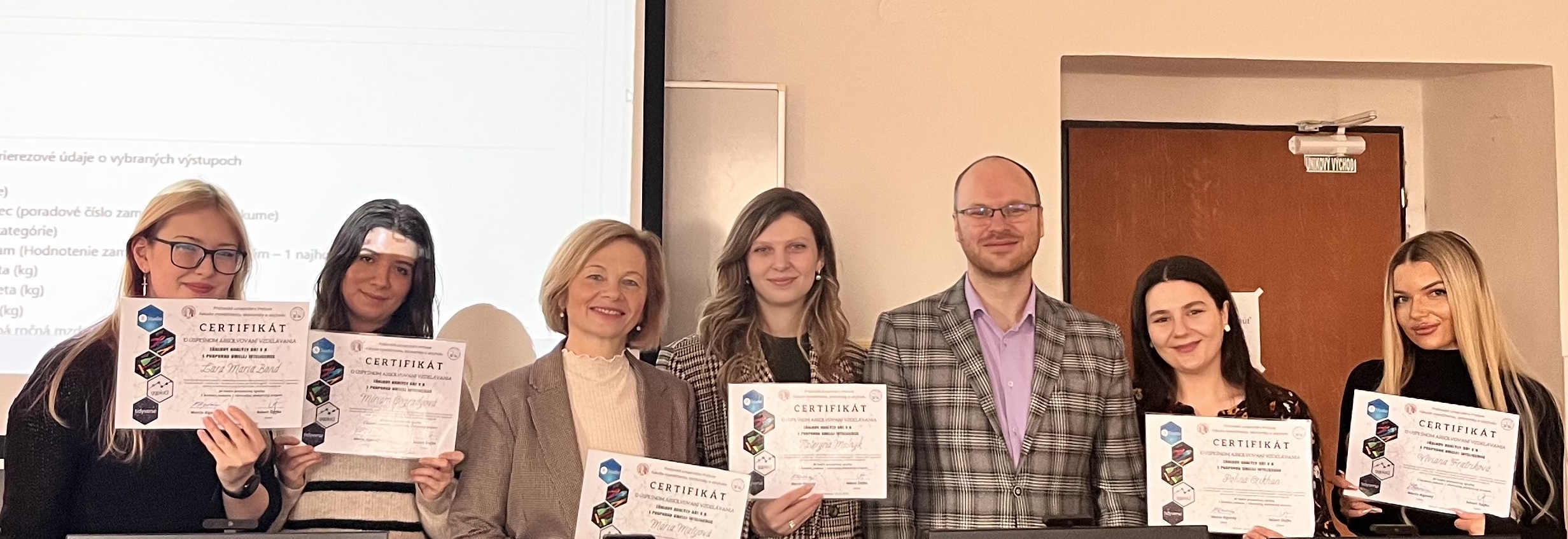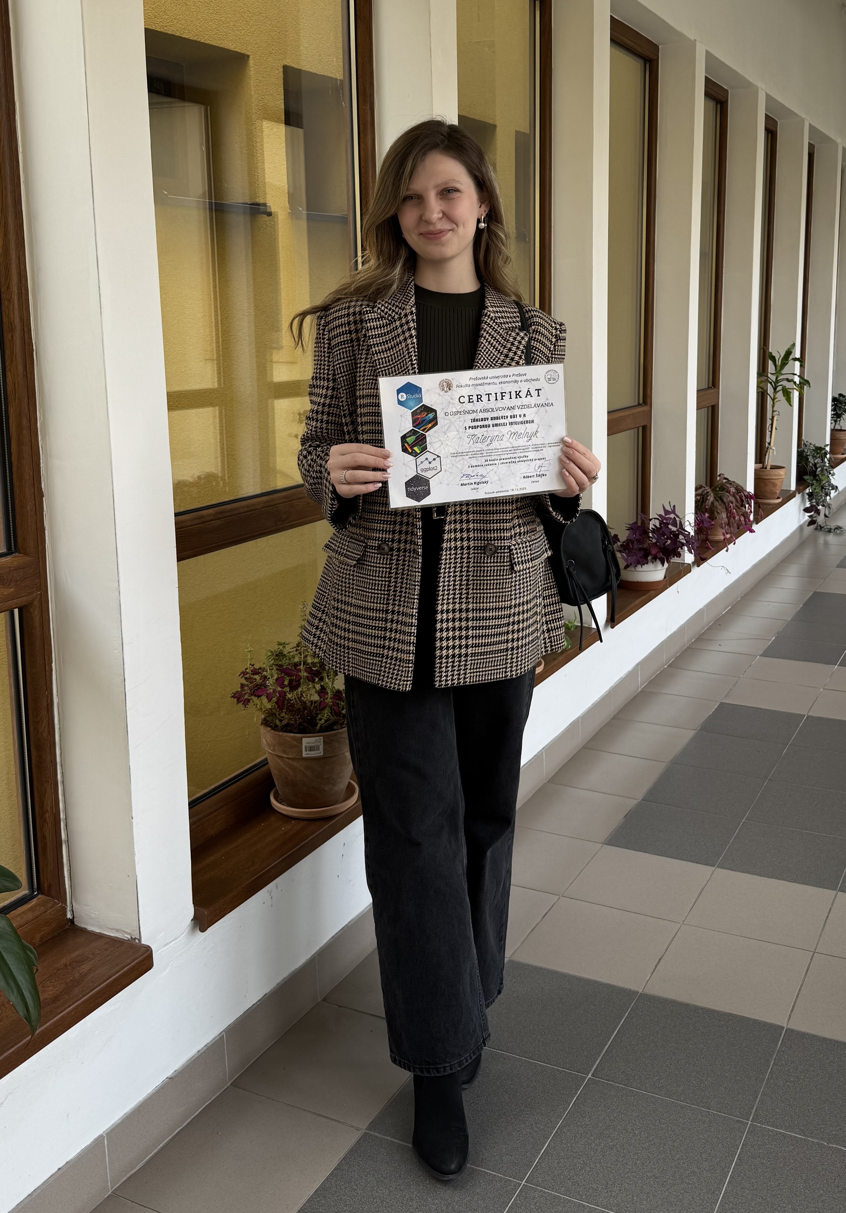 Počas zimného semestra akademického roka 2025/2026 sa členky KFUMM, Ing. Mária Matijová, PhD. a Mgr. Kateryna Melnyk, zúčastnili kurzu Základy analýzy dát v R s podporou umelej inteligencie v rozsahu 36 hodín prezenčnej výučby. 18. decembra 2025 im boli udelené certifikáty o úspešnom absolvovaní vzdelávania.
