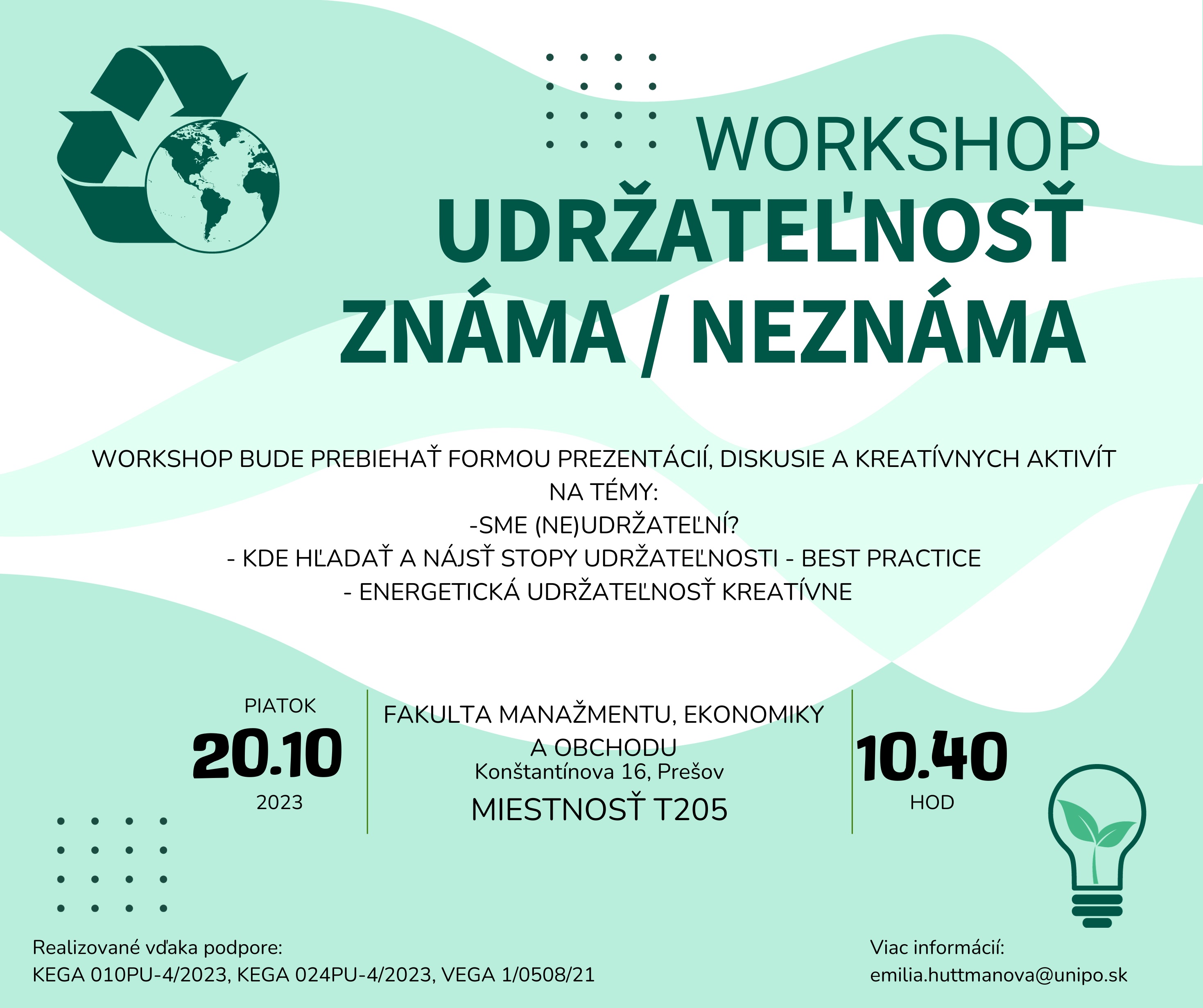 Vo svete, ktorý čelí naliehavým environmentálnym výzvam, @Fakulta manažmentu, ekonomiky a obchodu zorganizovala kreatívny workshop UDRŽATEĽNOSŤ – ZNÁMA / NEZNÁMA. Workshop sa uskutočnil dňa 20.10.2023 v Centre energetickej efektívnosti a obnoviteľných zdrojov energie, ktoré bolo zriadené na FMEO s podporou Ministerstva školstva, vedy, výskumu a športu SR, v rámci projektu Zelených univerzít. Toto podujatie vytvorilo inšpiratívnu platformu, ktorá umožnila študentom skúmať vybrané aspekty udržateľnosti a cirkularity.