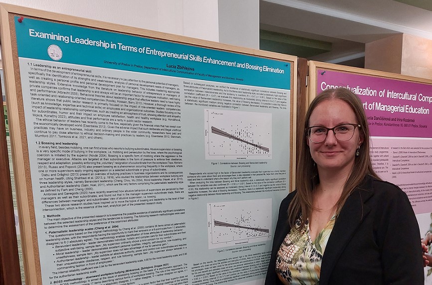 V posterovej sekcii odprezentovali výsledky svojho výskumu v rámci vedených grantov: doc. Mgr. Lucia Zbihlejová, PhD. (Príspevok: Examining Leadership in Terms of Entrepreneurial Skills Enhancement and Bossing Elimination/KEGA 018PU-4/2023 Tvorba tréningového programu rozvoja podnikateľských zručností a metakognitívnych schopností v kontexte eliminácie Dunning-Krugerovho efektu), Mgr. Eva Benková, PhD. (Príspevky v spoluautorstve: The Analysis of the Connections between Neuromarketing Attributes and Business BehaviourDeterminants/Benková, E. & Birknerová, Z./VEGA 1/0428/23 Výskum podvedomých reakcií zákazníkov s využitím eye-trackingu a ďalších nástrojov tvoriacich neuromarketingové inštrumentárium; b) Assessing the Attributes of Social and Emotional Managerial Competence in Terms of Gender and Age of Entrepreneurs/Benková, E. & Birknerová, Z./KEGA 018PU-4/2023 Tvorba tréningového programu rozvoja podnikateľských zručností a metakognitívnych schopností v kontexte eliminácie Dunnig-Krugerovho efektu), Mgr. Lucia Dančišinová, PhD. a PhDr. Irina Kozárová, PhD. (Spoločný príspevok: Conceptualization of Intercultural Competence as Part of Managerial Education/KEGA č. 004PU-4/2022 Integrácia špecifík interkultúrnej komunikácie do výučby odborného anglického jazyka) a PaedDr. Dagmara Ratnayake Kaščáková, PhD., MBA (Príspevok v spoluautorstve: Key Attributes Affecting the Value of European M&A Transactions/Gombár, M., et al.).