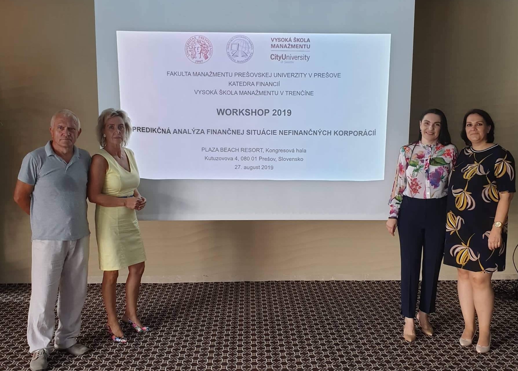 Doc. Ing. Sylvia Jenčová, PhD., Ing. Ľudmila Bednárová, PhD.,Mgr. Marta Lukáčová v spolupráci s Vysokou školou manažmentu v Trenčíne zorganizovali workshop "Predikčná analýza finančnej situácie nefinančných korporácií", ktorý sa konal 27. augusta 2019 v rezorte PLAZA BEACH RESORT v Prešove.