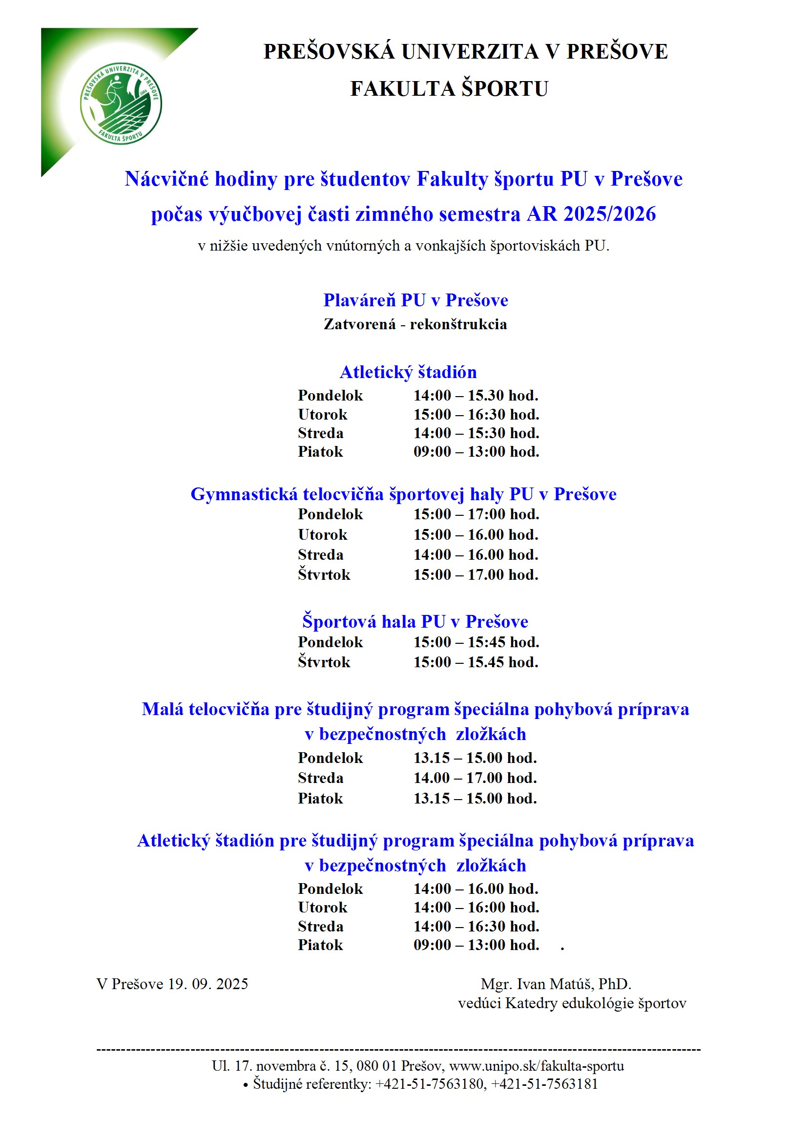 Nácvičné hodiny pre študentov Fakulty športu PU v Prešove počas ZS AR 2025/2026 Galéria Galéria Aktualizoval(a): Jaroslav Sekerák , 22.09.2025