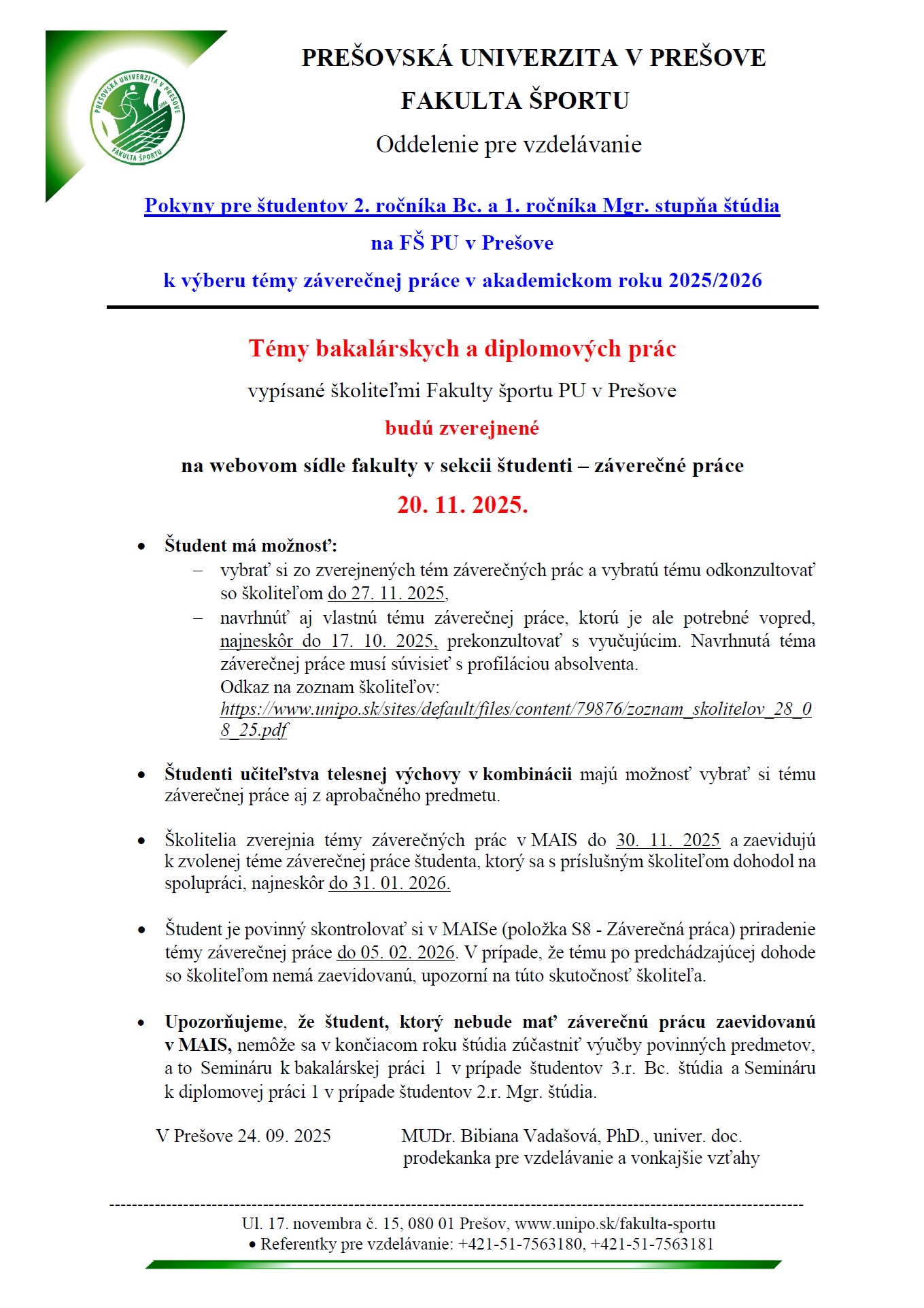 Pokyny k výberu tém záverečných prác v AR 2025/2026 Galéria Galéria Aktualizoval(a): Jaroslav Sekerák , 24.09.2025