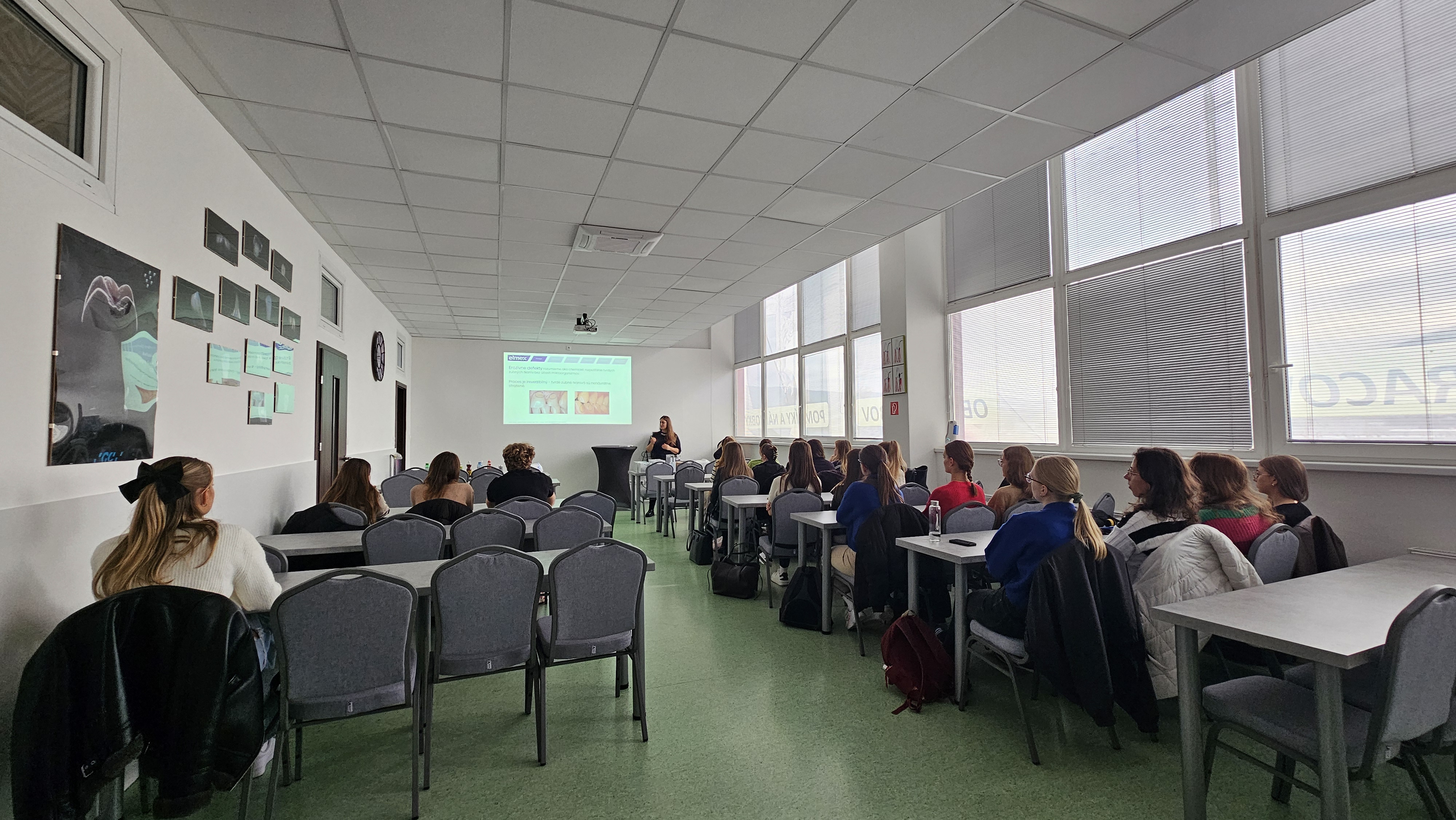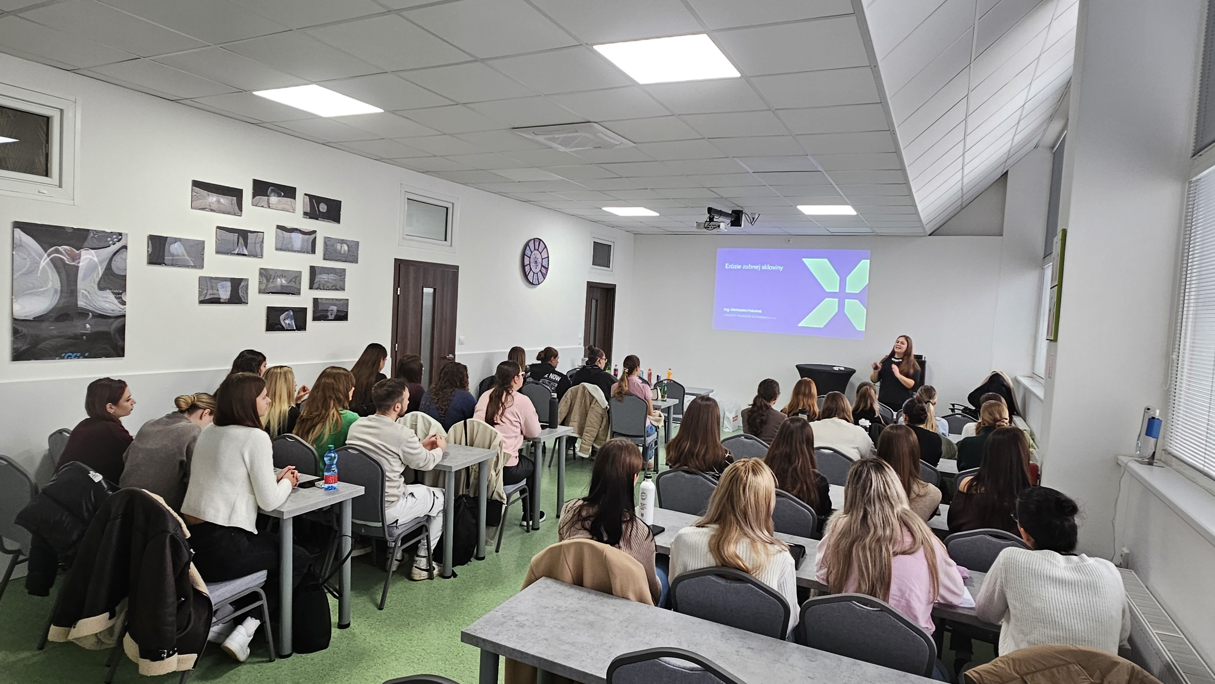 Prednášku viedla Mgr. Michaela Pokorná, ktorá študentom priniesla množstvo cenných informácií z oblasti prevencie zubného kazu a dentálnych erózií. V rámci prezentácie boli predstavené aj aktívne látky využívané v produktoch, ich mechanizmus účinku a odporúčania pre správnu voľbu produktov v každodennej praxi dentálneho hygienika.