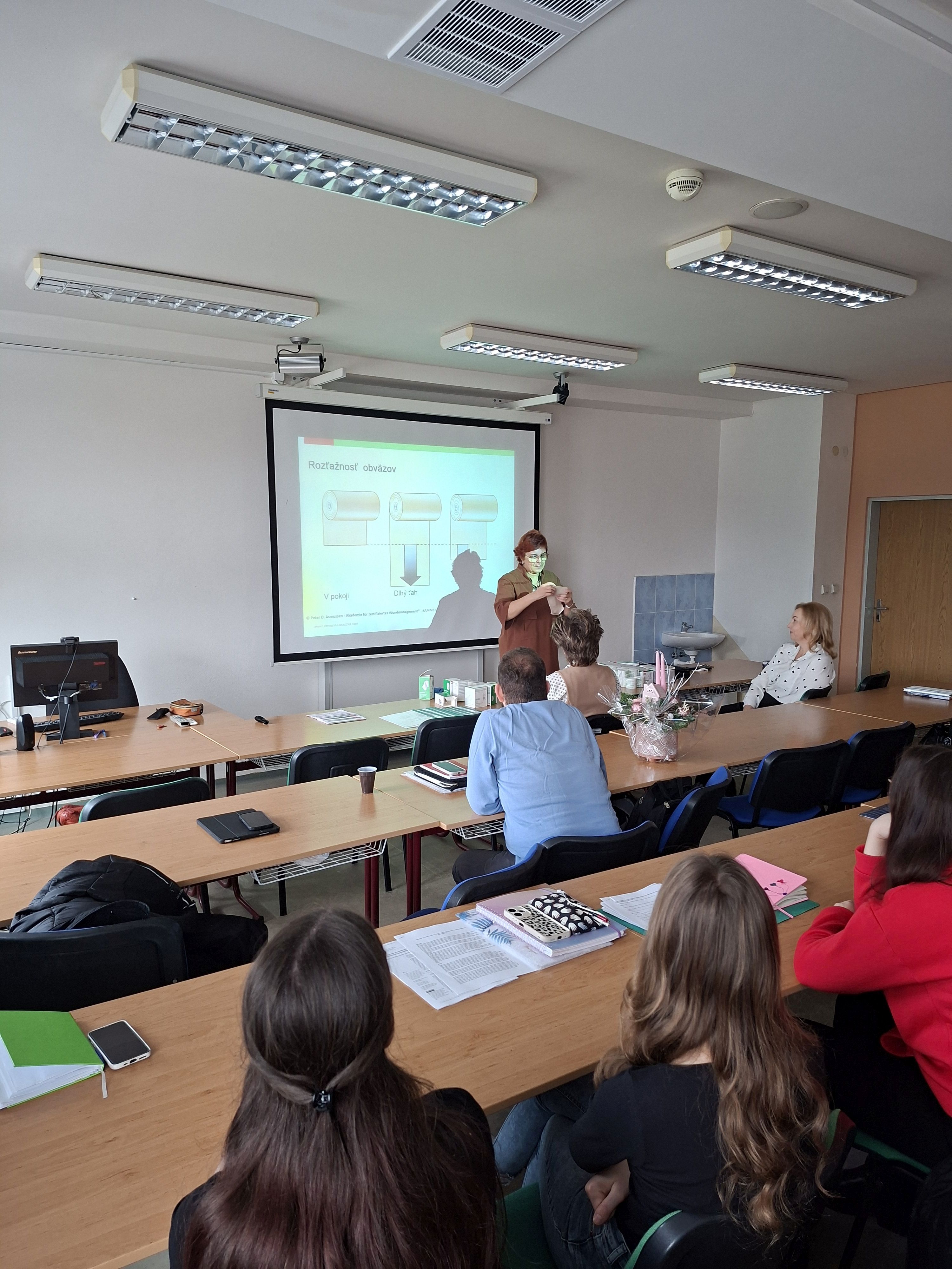 1.12.2025 sme pre študentov prvého ročníka II. stupňa vysokoškolského štúdia v odbore ošetrovateľstvo organizovali workshop s názvom: „Kompresívna terapia“, ktorý viedla PhDr. Alena Oborilová, Product/sales manager Lohmann & Rauscher. Podujatie bolo organizované v rámci Týždňa vedy a techniky na Slovensku. Ovládanie kompresívnej terapie patrí medzi pokročilé odborné zručnosti sestier. Vzdelávanie v tejto oblasti zvyšuje samostatnosť, sebavedomie a kvalitu poskytovanej starostlivosti.
