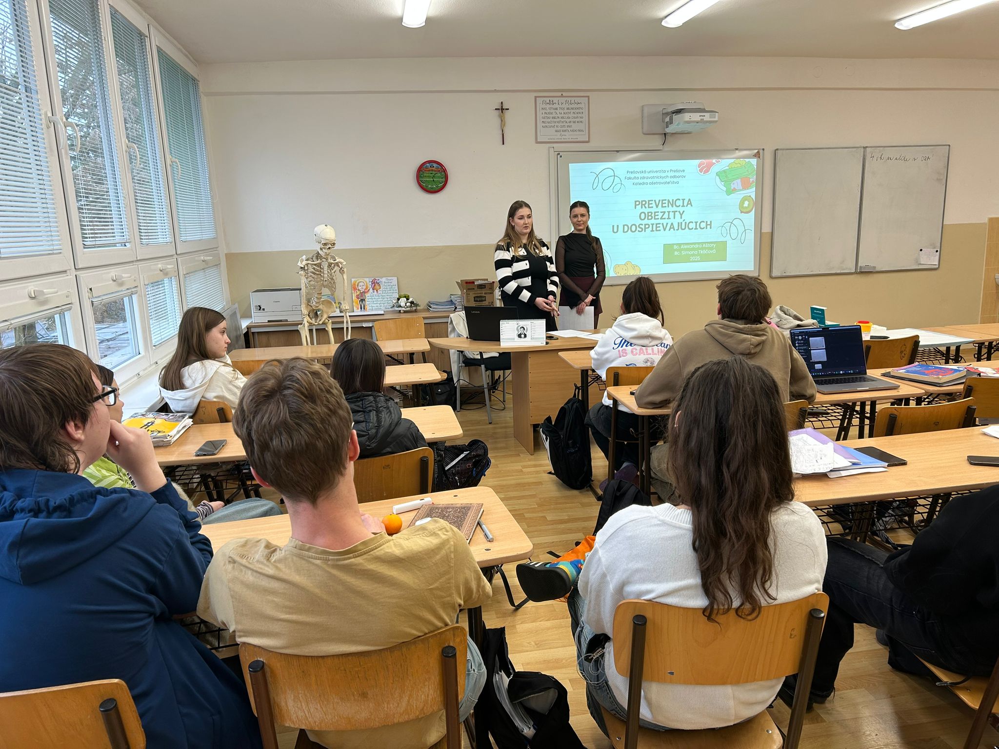 Študentky katedry ošetrovateľstva dennej magisterskej formy štúdia Bc. Simona Tkáčová a Bc. Alexandra Aštary dňa 11.12. 2025 realizovali odbornú prednáška na tému „Prevencia obezity u detí a dospievajúcich“ pod odborným vedením PhDr. Mgr. J. Cinovej, PhD. a PhDr. A. Šuličovej, PhD.na Katolíckej spojenej škole sv. Mikuláša v Prešove.