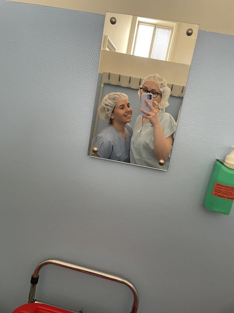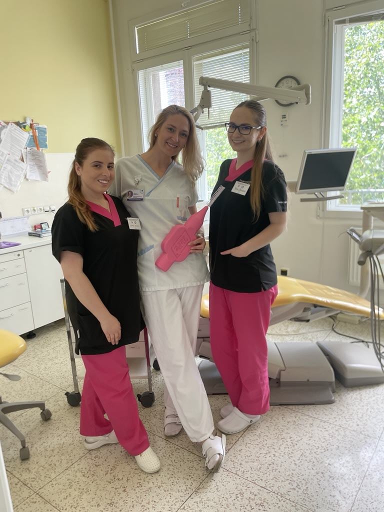 "Hneď v prvý deň stáže nás privítala vrchná sestra Stomatologického oddelenia Všeobecní fakultní nemocnice a zoznámila nás s kolektívom lekárov, zdravotných sestier a dentálnych hygieničiek. Za uplynulé týždne sme mali možnosť vidieť už niekoľko zákrokov napríklad otvorenú kyretáž parodontálnych vačkov, zavádzanie implantátov či sinus lift. Veľmi nás zaujala ambulancia orálnych slizníc, kde sa špecializujú na problémy v ústnej dutine, s ktorými si v bežných ambulanciách nemôžu poradiť. Každý prípad sa nám pani doktorky snažia podrobne vysvetliť. Je to pre nás veľmi prínosné, keďže ako dentálni hygienici veľakrát vidíme rôzne zmeny v ústnej dutine a je dôležité ich správne odlíšiť a posudzovať. Na oddelení stomatochirurgie sme mali možnosť byť pri bežných extrakciáh zubov a podarilo sa nám byť aj pri extrakcii cysty. V samotnej ambulancii dentálnej hygieny sa nás ujali veľmi milé dentálne hygieničky, ktoré sa nám snažia byť nápomocné pri ošetrovaní pacientov. Sme zvedavé čo nás ešte na tejto stáži čaká a aké zaujímavé informácie si odtiaľto odnesieme."