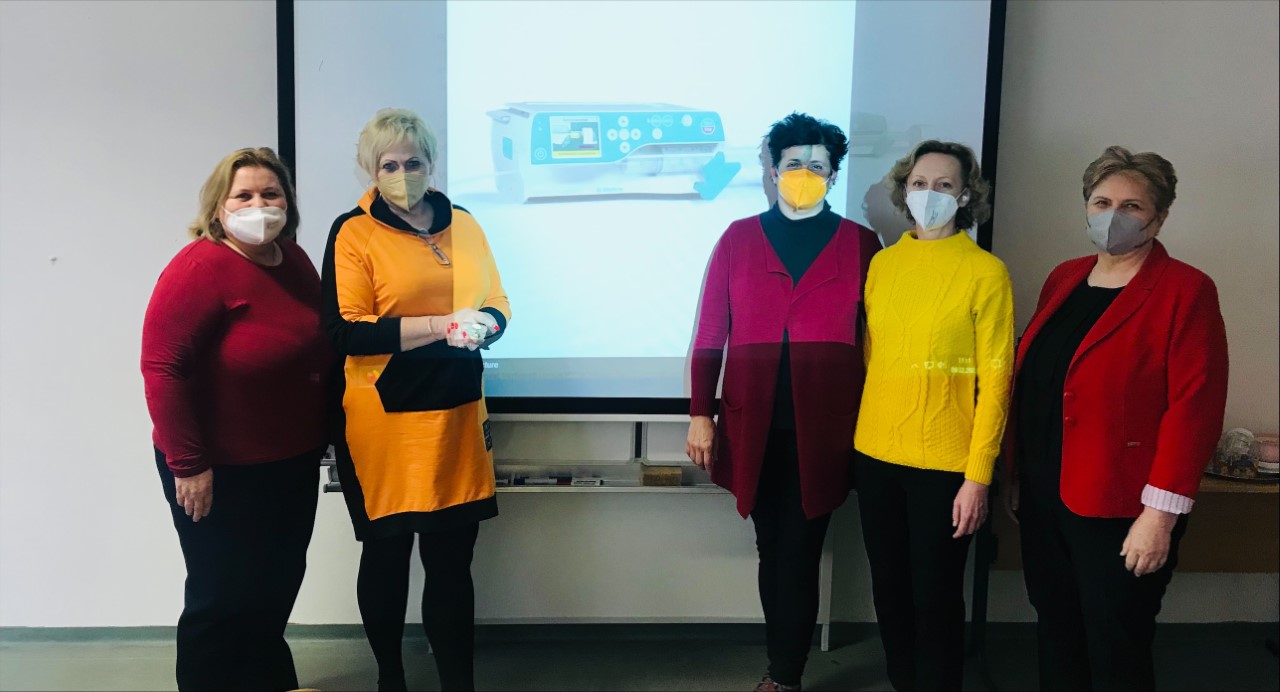 Dňa 09. februára 2022 sa na Fakulte zdravotníckych odborov, na Katedre ošetrovateľstva uskutočnilo odborné školenie pre prácu s objemovou infúznou pumpou a lineárnym perfúzorom, ktoré bolo realizované zástupcom firmy Braun p. Ing. Patrikom Faixom. Školenia sa zúčastnili členky projektu KEGA PhDr. Slávka Mrosková, PhD., PhDr. Iveta Ondriová, PhD., PhDr. Jana Cuperová, PhD., MPH, PhDr. Dagmar Magurová, PhD. a PhDr., Mgr. Alena Schlosserová, PhD., ktoré sa oboznámili s technickými parametrami a údržbou týchto pomôcok a zároveň si manuálne vyskúšali ovládanie jednotlivých funkcií objemovej infúznej pumpy a perfúzora.