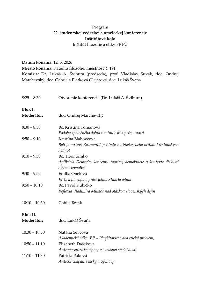 Chceme sa poďakovať všetkým zúčastneným študentom za ich precíznu prípravu a odvahu prezentovať svoje výskumy pred komisiou a kolegami. Kvalita príspevkov potvrdila, že filozofia a etika majú u nás silné zázemie a mladú generáciu plnú potenciálu.