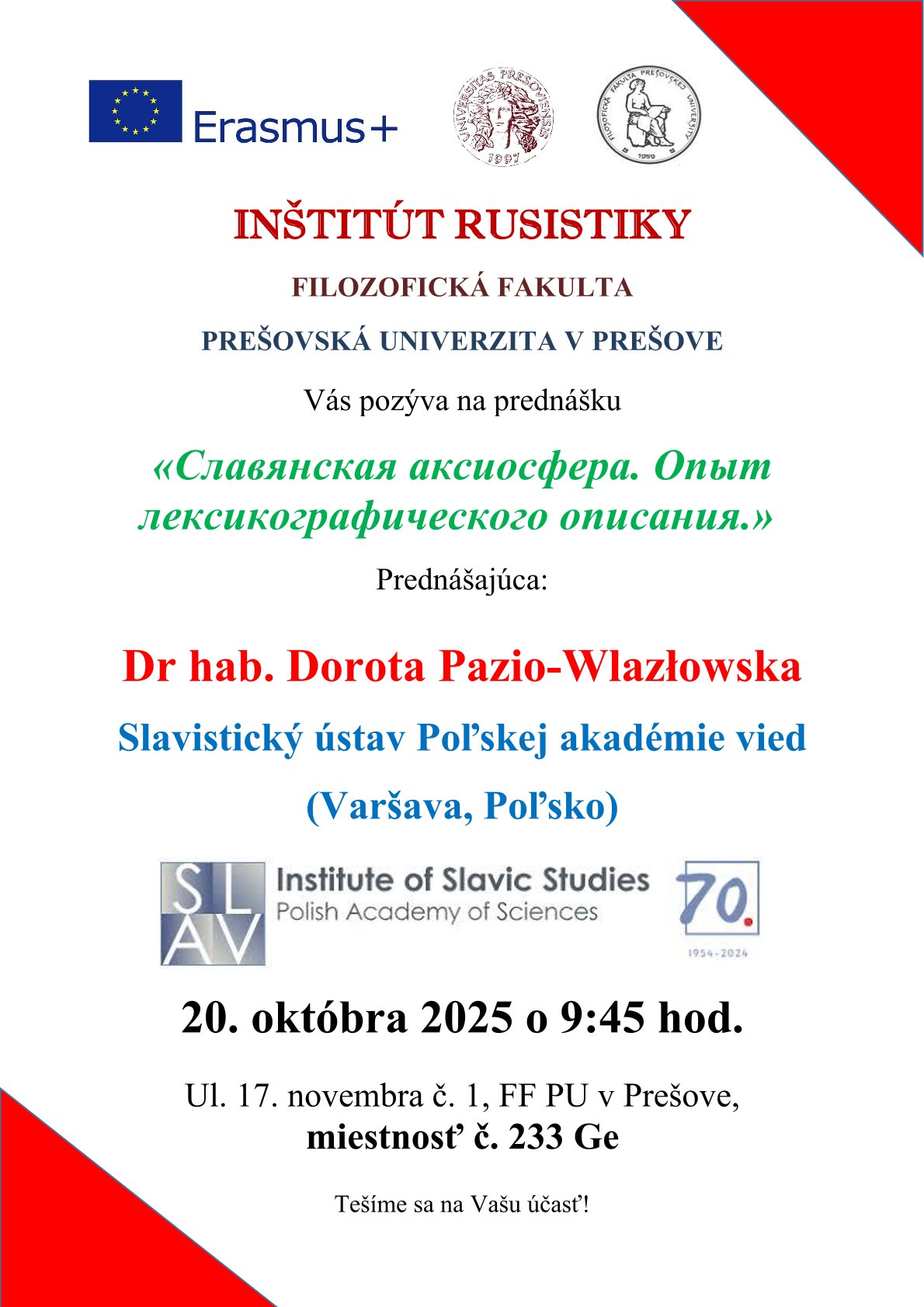 pozývame Vás na prednášku kolegyne Dr hab. Doroty Pazio-Wlazłowskej zo Slavistického ústavu Poľskej akadémie vied (Varšava, Poľsko), ktorá k nám pricestuje v rámci programu Erasmus+.