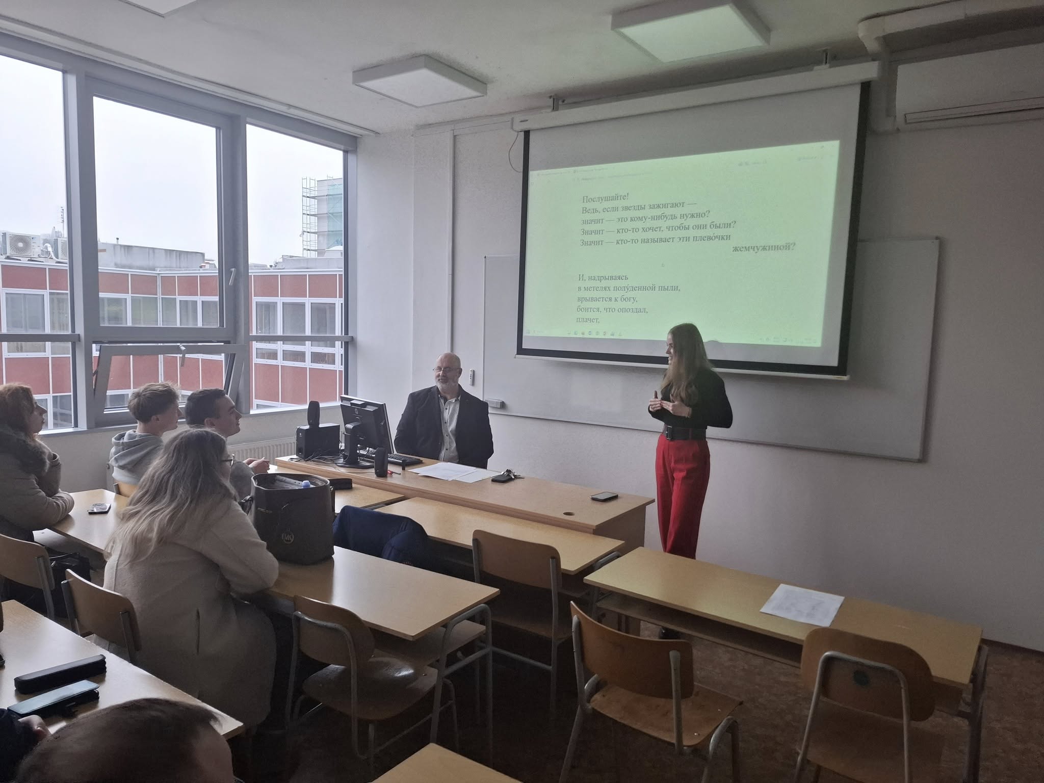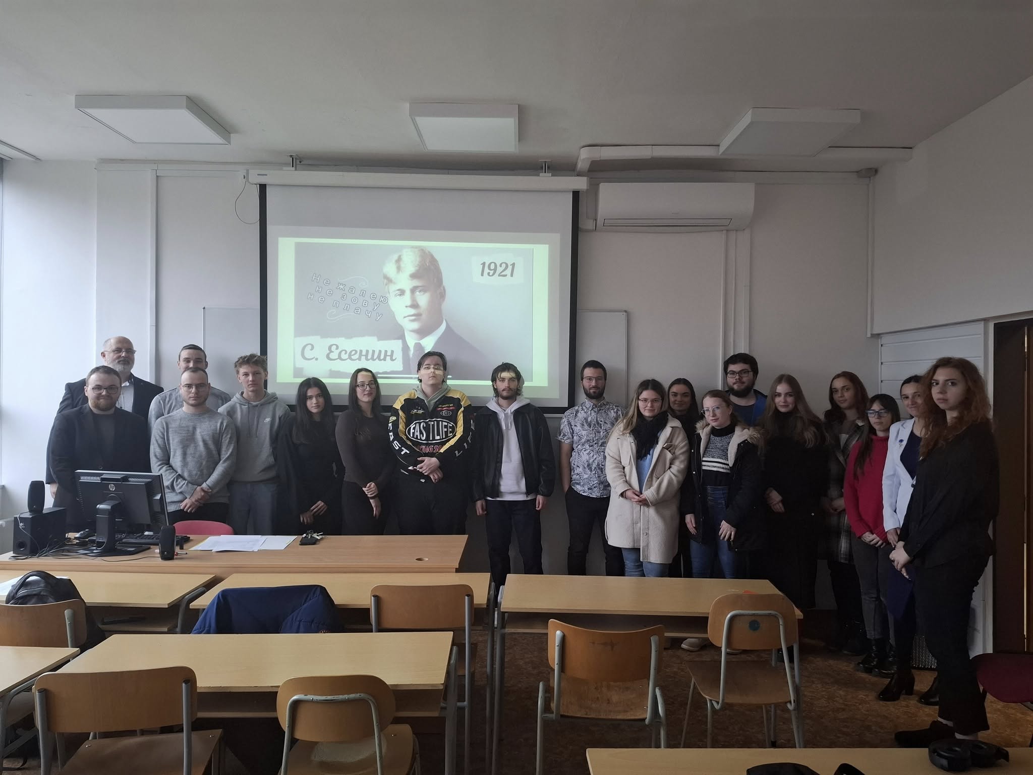 Riaditeľ Inštitútu rusistiky FF PU prof. PhDr. Ľubomír Guzi, PhD. v úvode prednášky krátko predstavil biografiu a literárnu tvorbu Vladimira Majakovkého a Sergeja Jesenina, dvoch významných básnikov XX. stor., obdobia tzv. Strieborného veku ruskej literatúry.