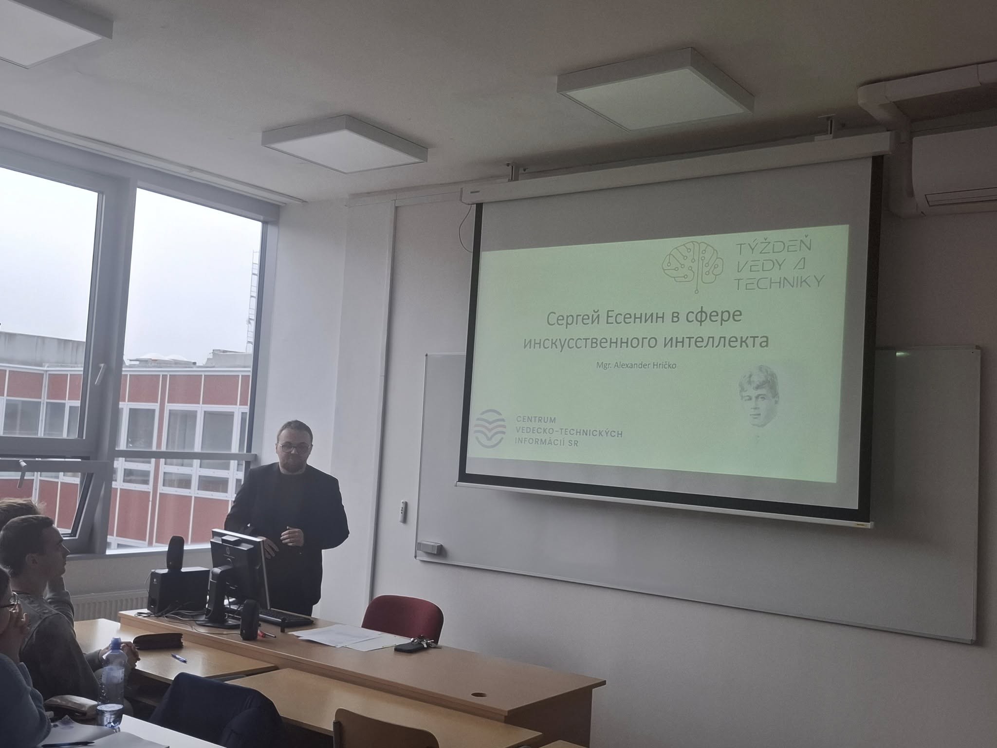 Mgr. Alexander Hričko predstavil vybranú poéziu Sergeja Jesenina, na základe ukážok z umelej inteligencie predstavil krátku analýzu vybraných básní a predstavených motívov v poézii.