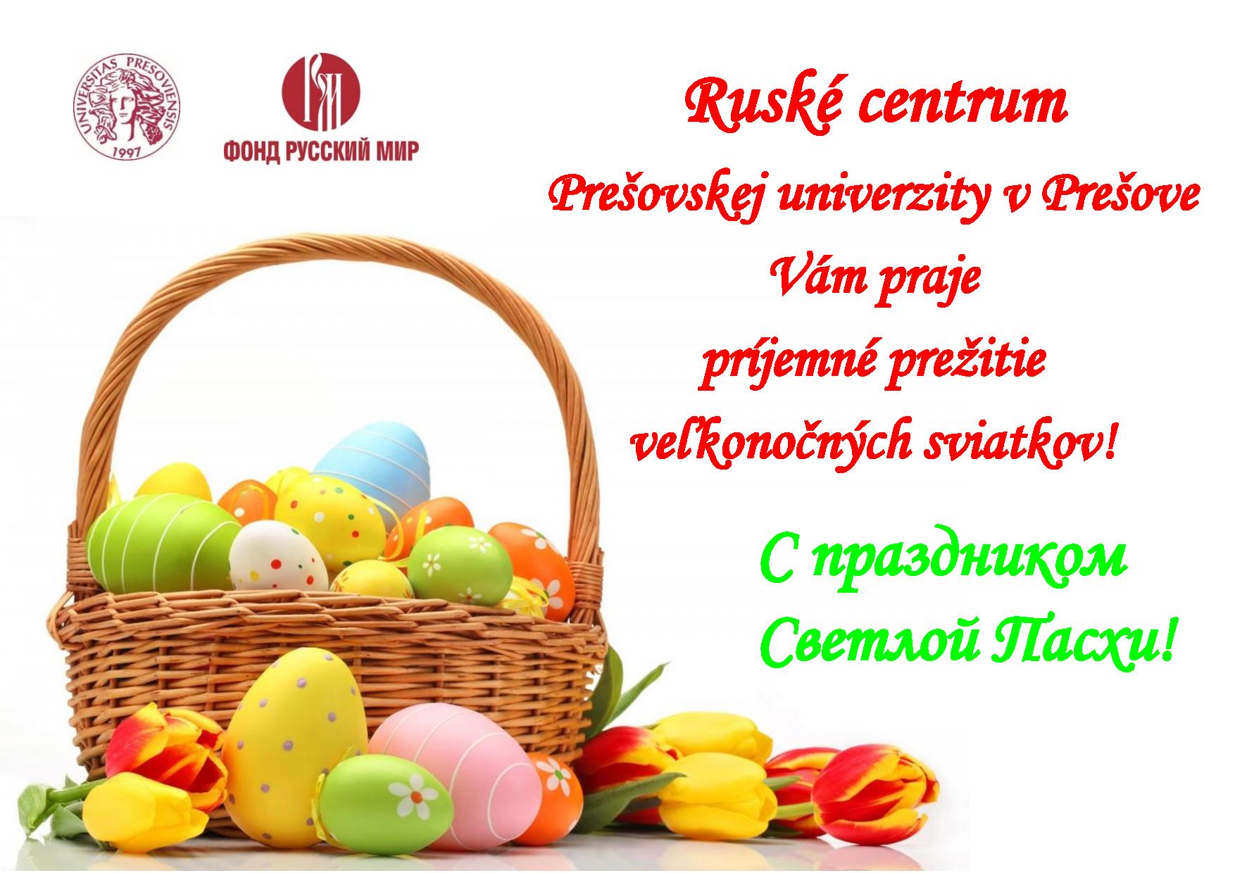 Príjemné prežitie veľkonočných sviatkov! Vážení kolegovia, milí študenti a priatelia! Prajeme Vám príjemné prežitie veľkonočných sviatkov, veľa zdravia a rodinnej pohody v kruhu najbližších! С наступающим праздником Светлой Пасхи! Galéria Galéria Aktualizoval(a): Gabriela Turisová, 01.04.2021
