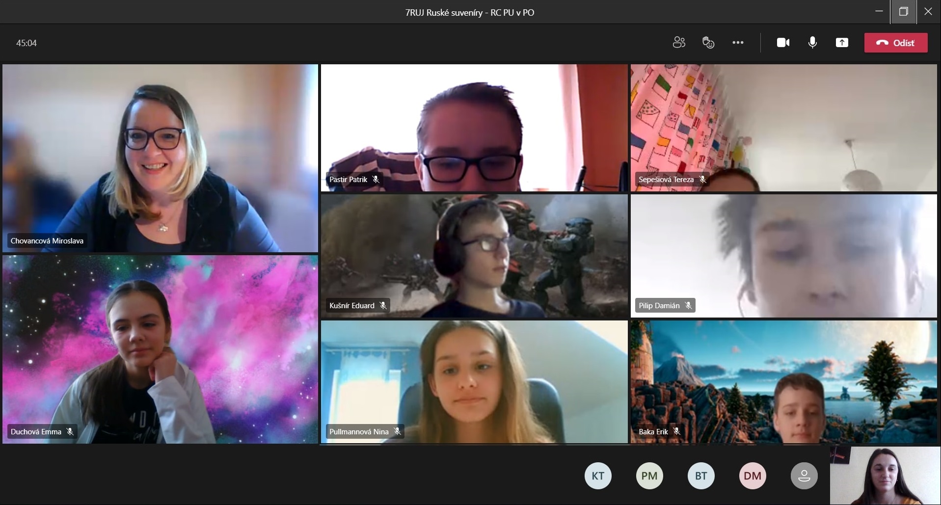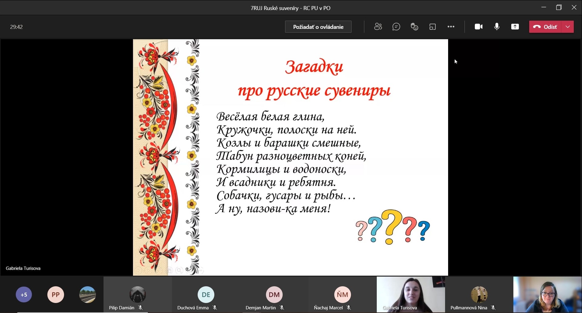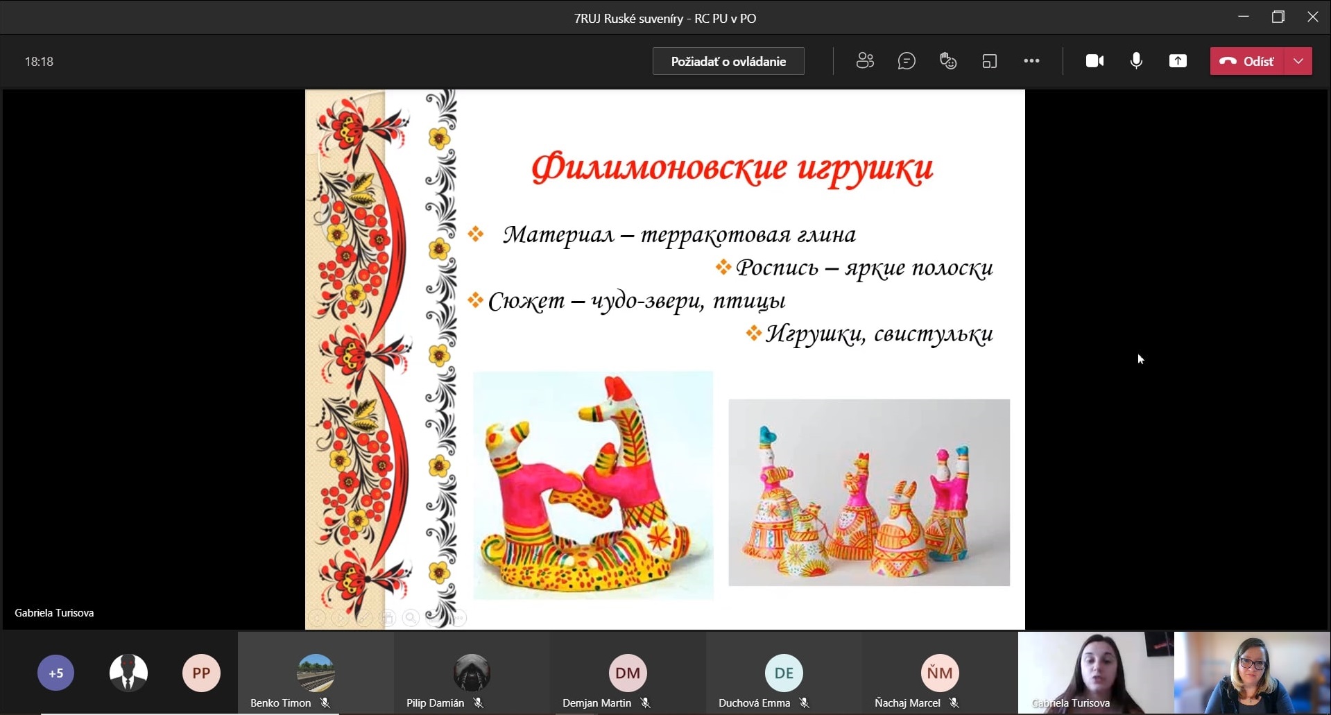 Online hodina bola zameraná na tému ruské suveníry. V úvode žiaci uvádzali príklady suvenírov a pamätných predmetov, ktoré si ľudia zvyčajne prinášajú z rôznych krajín a následne sa dozvedeli zaujímavé informácie o niekoľkých unikátnych ruských suveníroch, napr. chochlome, keramike Gžeľ, Palechskej škatulke, Žostovských podnosoch, Dymkovských, Filimonovských a Bogorodských hračkách, šatkách z Pavlovského Posadu, Vologodskej čipke, samovare, matrioške a iných.