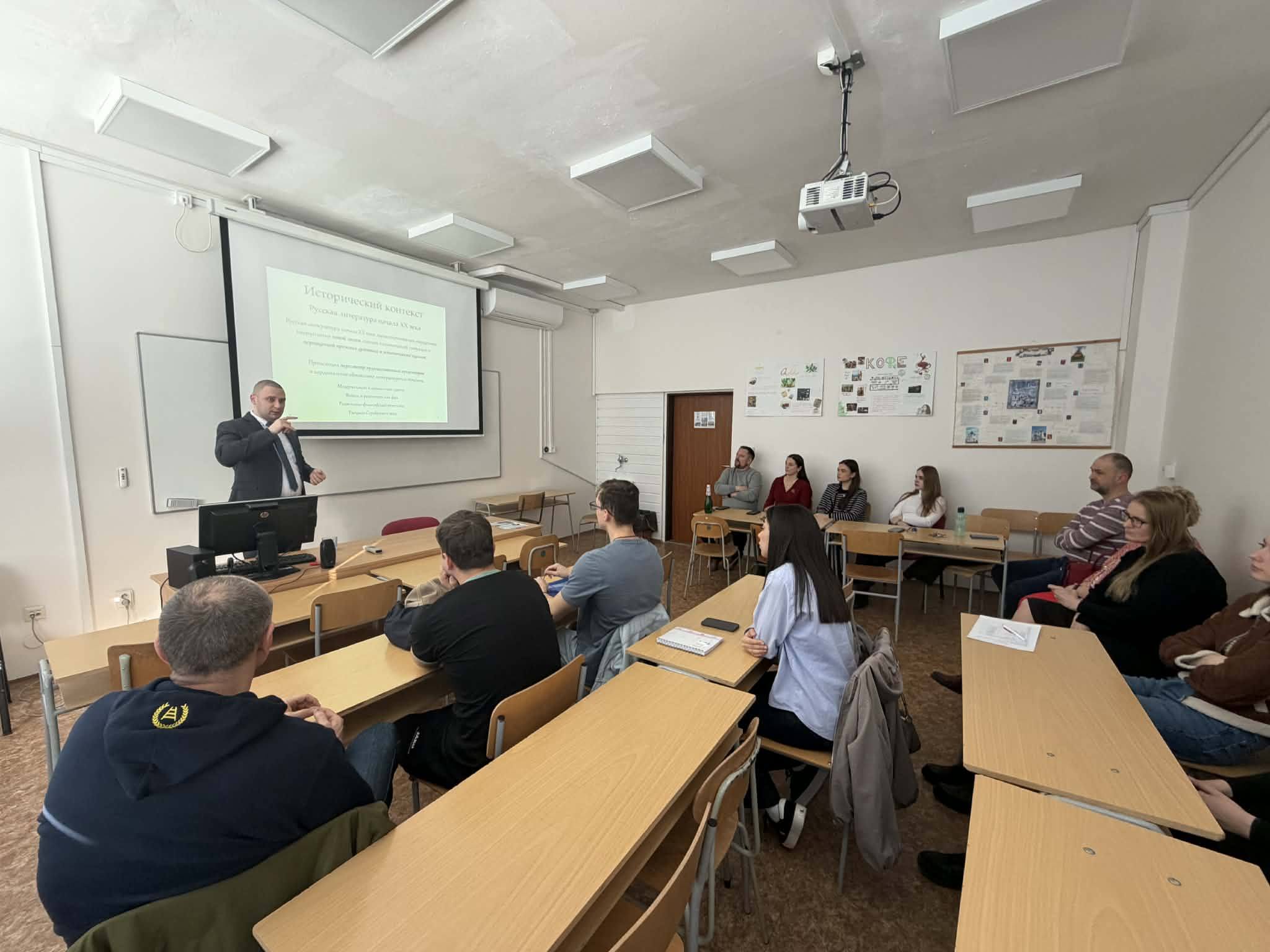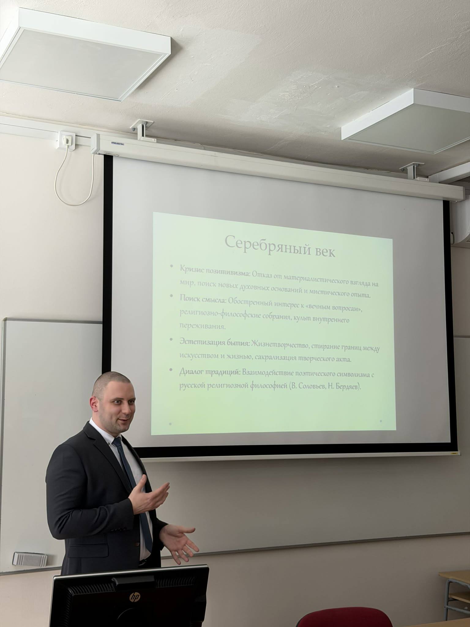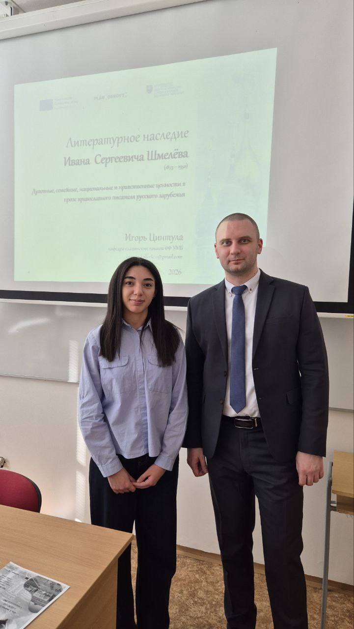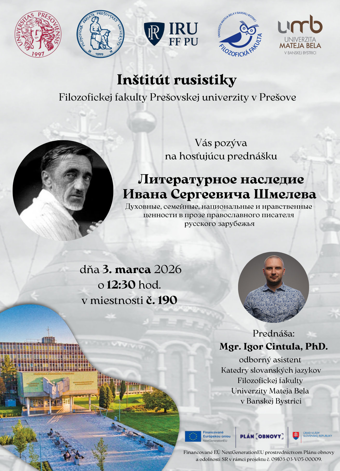Na Inštitúte rusistiky FF PU sa dňa 3. marca 2026 uskutočnila hosťujúca prednáška kolegu Mgr. Igora Cintulu, PhD. z Katedry slovanských jazykov Filozofickej fakulty Univerzity Mateja Bela v Banskej Bystrici. V rámci podnetnej prednášky s názvom Литературное наследие Ивана Сергеевича Шмелова bolo podrobne predstavené literárne dedičstvo ruského spisovateľa I. S. Šmeľova s dôrazom na duchovné, morálne a rodinné hodnoty v ruskej literatúre.