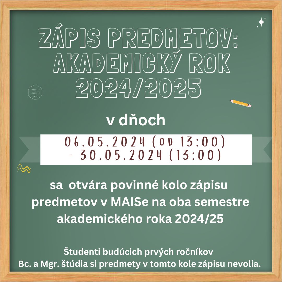 Zápis predmetov na akademický rok 2024/25 Galéria Galéria Aktualizoval(a): Zuzana Nováková, 06.05.2024