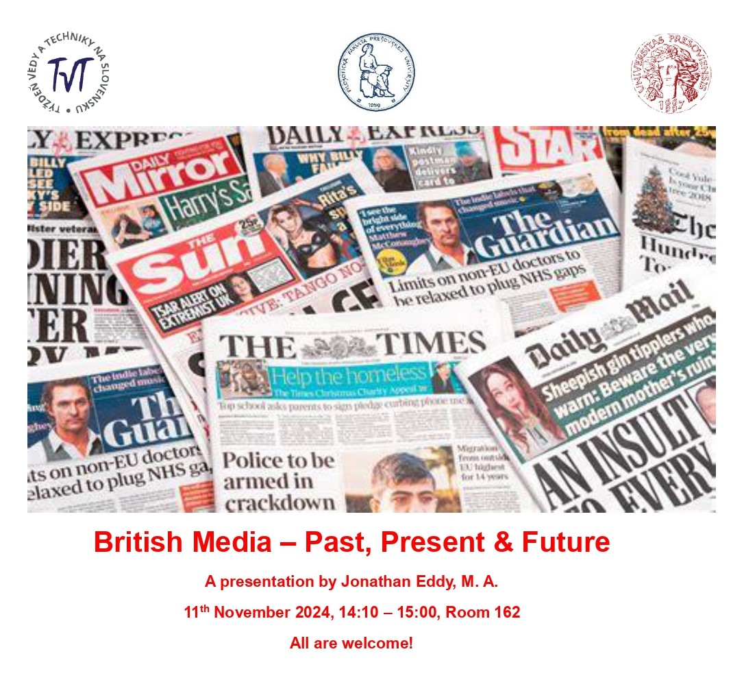 Týždeň vedy a techniky - British Media - Past Present & Future (11. 11. 2024: 14.10 – 15.00) Prezentácia aktuálnej témy v podaní rodeného hovoriaceho Galéria Galéria Aktualizoval(a): Veronika Bežilová, 06.11.2024