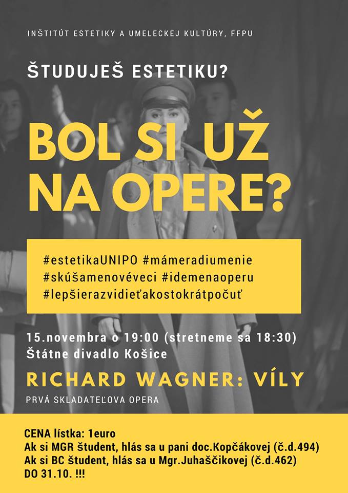 Bol si už v opere? Návšteva opery Richarda Wagnera: Víly Spoločná návšteva opery v Štátnom divadle v Košiciach sa pod vedením doc. Kopčákovej a Mgr. Juhaščikovej uskutočnila 15. novembra 2017. Galéria Galéria Aktualizoval(a): Unipo, 10.01.2018