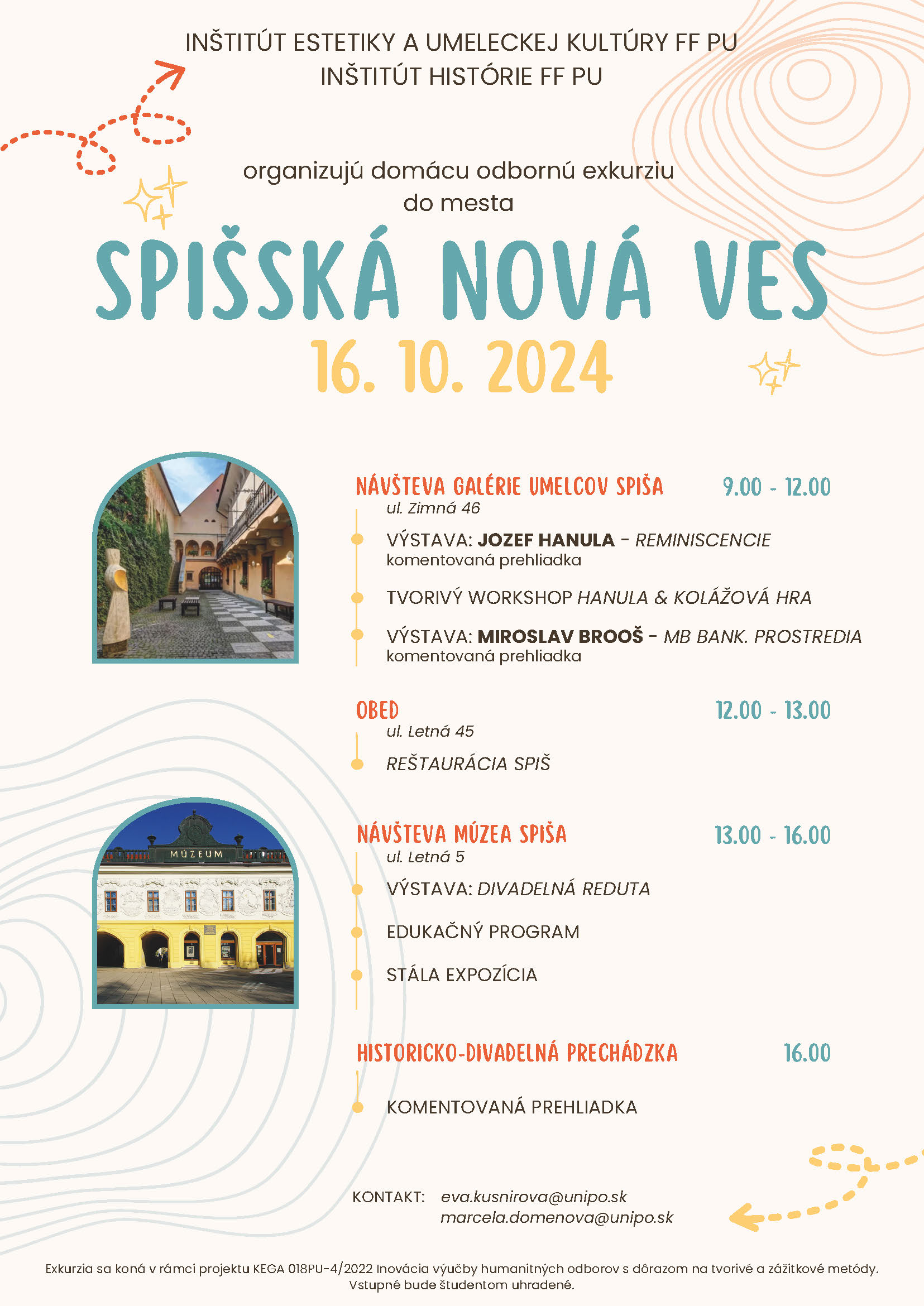 v rámci projektu KEGA č. 018PU-4/2022 Inovácia výučby humanitných odborov s dôrazom na tvorivé a zážitkové metódy sme pre Vás tentokrát pripravili spoločnú domácu exkurziu do Spišskej Novej Vsi, dňa 16. 10. 2024. Bohatý program exkurzie nájdete na zverejnenom plagáte.