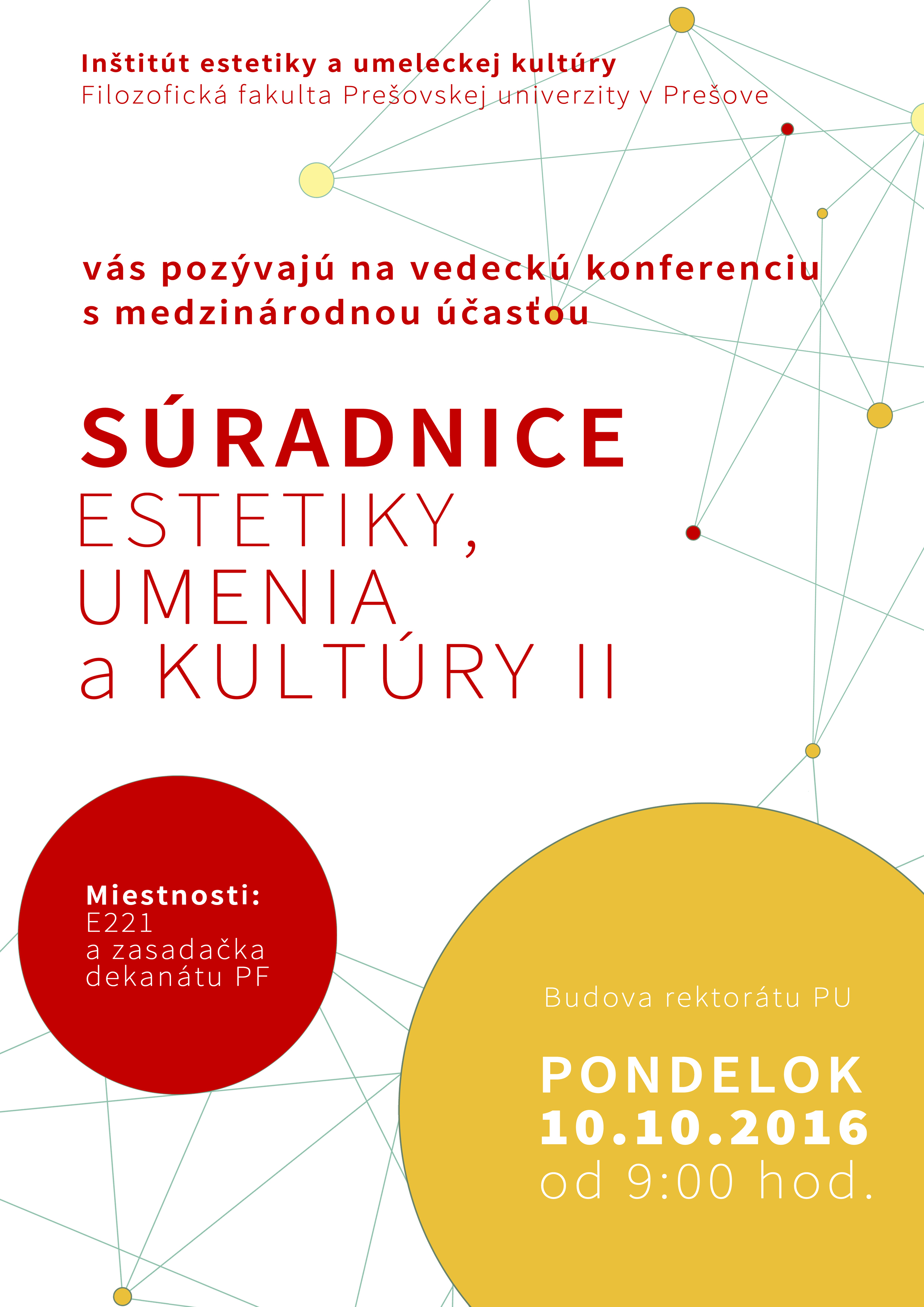 Pripravovaný druhý ročník vedeckej konferencie Súradnice estetiky, umenia a kultúry (10.10.2016) je štruktúrovaný do dvoch sekcií. Prvú sekciu reprezentuje nosná téma 25 rokov študijného odboru estetika v Prešove, a v tomto zmysle je jej zámerom reflexia stavu a charakteru či špecifík odboru estetika v Prešove, vrátane jej vedeckých, publikačných, komunikačných stratégií a kontextov s európskou a svetovou estetikou, prípadne prínosov slovenskej estetiky v európskom kontexte. Jej súčasťou sú aj aktuálne témy súčasnej estetiky v siločiarach svetového i európskeho estetického myslenia.