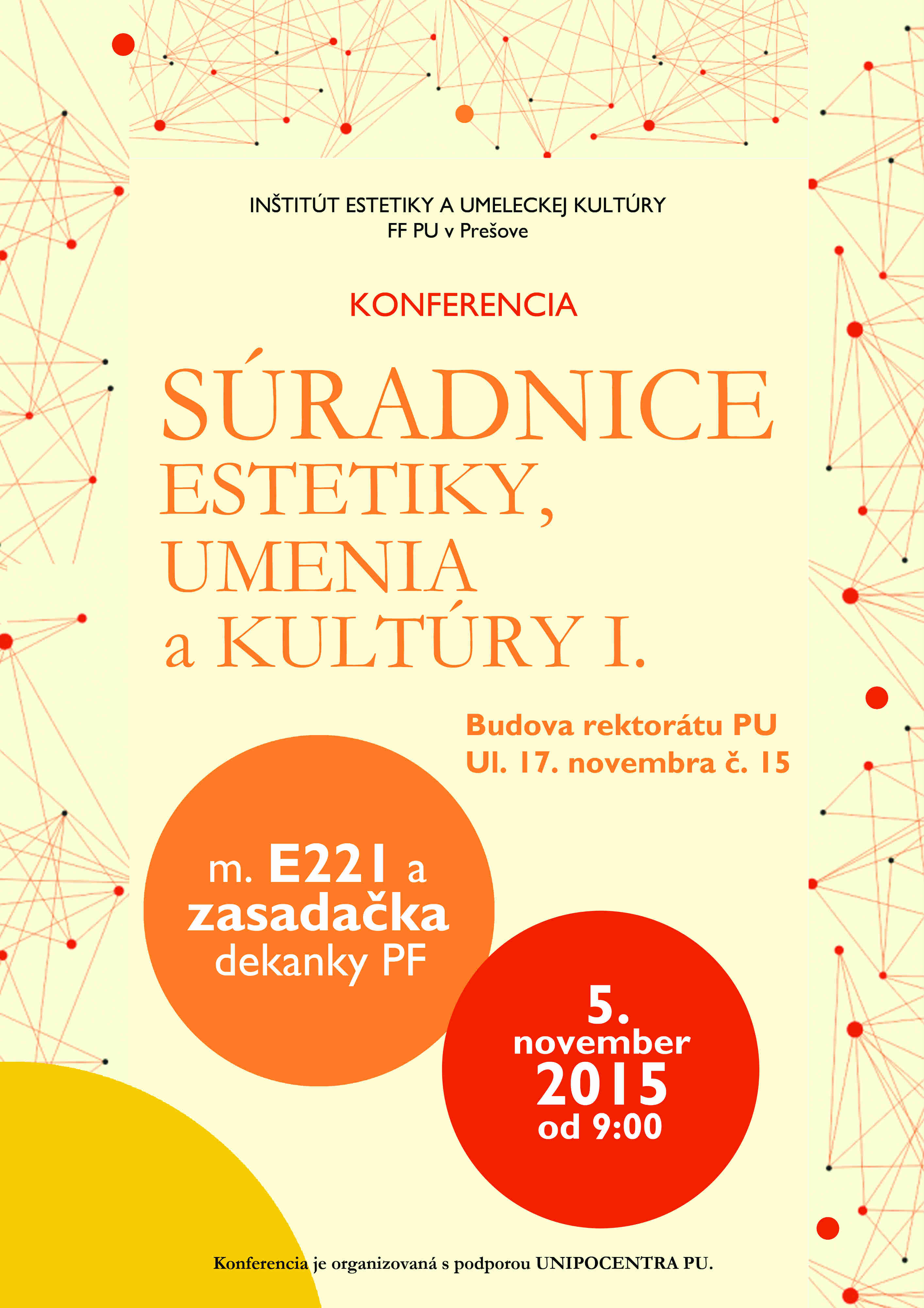V dňoch 5. - 6. 11. 2015 na pôde Filozofickej fakulty Prešovskej univerzity v Prešove sa uskutočnil prvý ročník vedeckej konferencie s medzinárodnou účasťou Súradnice estetiky, umenia a kultúry. Zámerom podujatia je napriek šírke záujmov i premenlivej aktuálnosti určitých vedeckých problémov v našom časopriestore, prostredníctvom konkretizácie snahy usúvzťažniť či nájsť zjednocujúci moment pre založenie vedeckého fóra s dlhodobejšou tradíciou, v rámci ktorého bude možné vytvoriť flexibilný priestor pre širší diskurz o problémoch estetiky, umenia a kultúry a ich teoretickej estetickej a umenovednej reflexii.