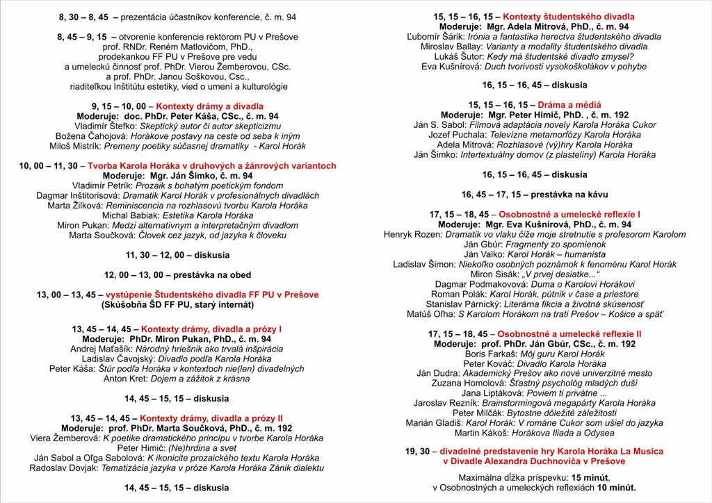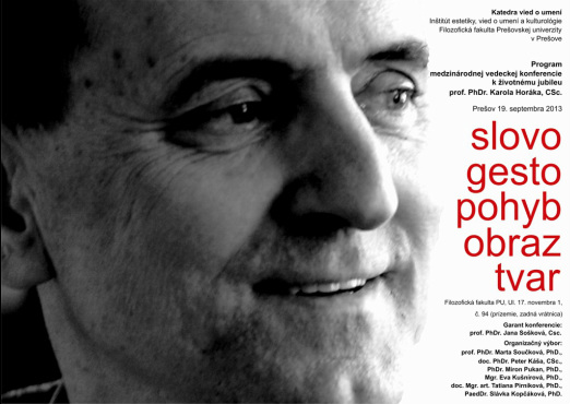 Medzinárodná vedecká konferencia Slovo, gesto, pohyb, obraz, tvar, ktorá sa konala pri príležitosti životného jubilea prof. PhDr. Karola Horáka, CSc., slovenského dramatika, prozaika, literárneho i divadelného vedca, vysokoškolského pedagóga, aktívneho tvorcu sa uskutočnila 19. septembra 2013. Konferencia – aspoň v náznakoch – ponúkla možnosť retrospektívne zmapovať jeho prínos vo viacerých umeleckých druhoch či žánroch, umeleckej a vedeckej činnosti ako aj v rozličných spoločenských aktivitách.