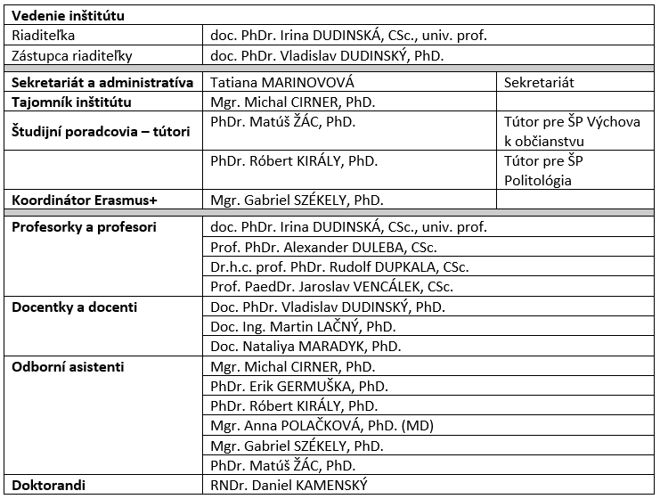 Inštitút politológie vznikol na FF PU v Prešove v roku 1993 ako druhé akademické pracovisko v danom odbore v Slovenskej republike. Inštitút má dlhoročné skúsenosti s riešením domácich a medzinárodných grantových projektov (štátny program výskumu a vývoja APVV, grantové projekty VEGA, KEGA, TEMPUS a Medzinárodný vyšehradský fond). Študijný odbor Politické vedy má akreditované všetky tri vzdelávacie stupne v dennej aj externej forme (bakalársky, magisterský a doktorandský v študijnom programe 3.1.6 Teória politiky). Pracovníci Inštitútu majú multidisciplinárne zázemie v politológii, sociológii, histórii, geografii, práve, ekonómii, verejnej správe a filozofii.