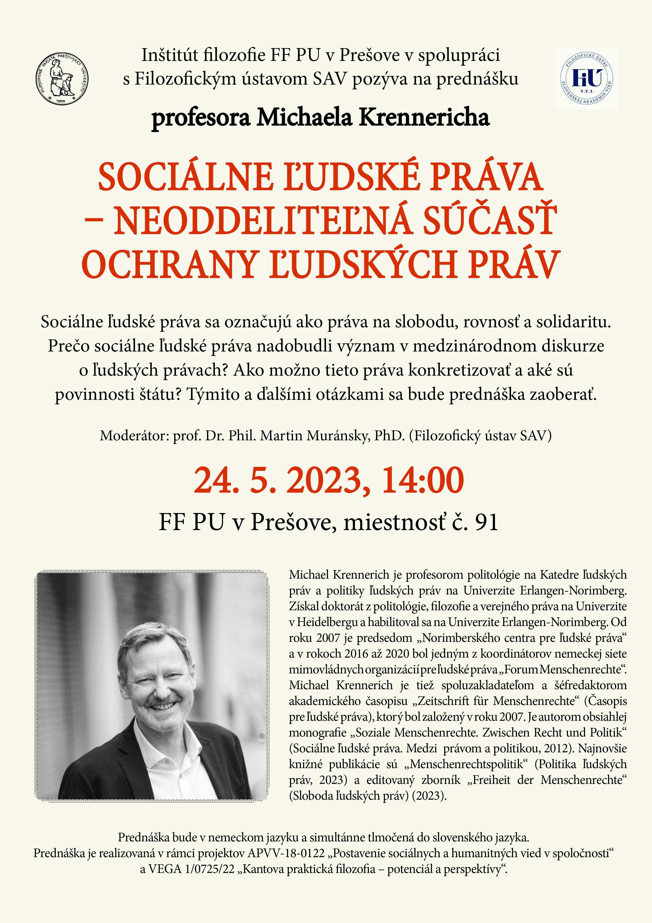Prednáška prof. Michaela Krennericha "Sociálne ľudské práva - neoddeliteľná súčasť ochrany ľudských práv" Galéria Galéria Aktualizoval(a): Lukáš Švihura, 01.06.2023