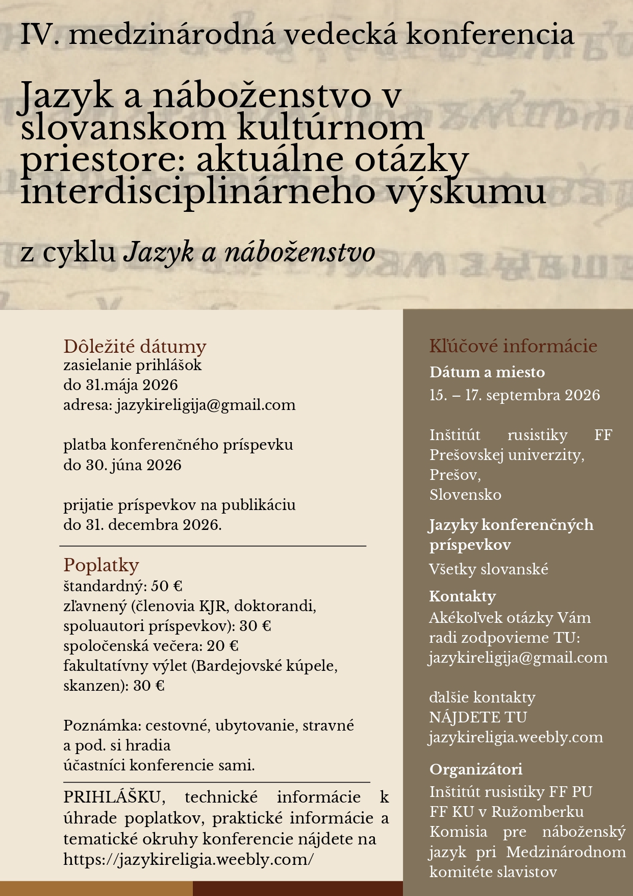 Konferencia: Jazyk a náboženstvo v slovanskom kultúrnom priestore: aktuálne otázky interdisciplinárneho výskumu Galéria Galéria Aktualizoval(a): Michaela Sepešiová , 07.04.2026