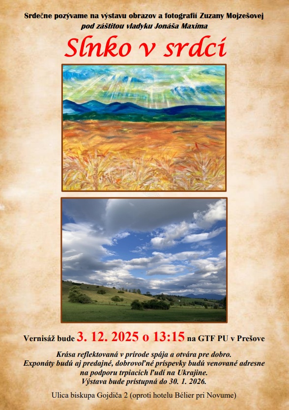 Pozvánka na dobročinnú výstavu obrazov a fotografií v priestoroch GTF PU, od 3.12.2025 o 13:15 Galéria Galéria Dokumenty Dokumenty Výstava slnko v srdci Aktualizoval(a): Valer Halečka , 27.11.2025