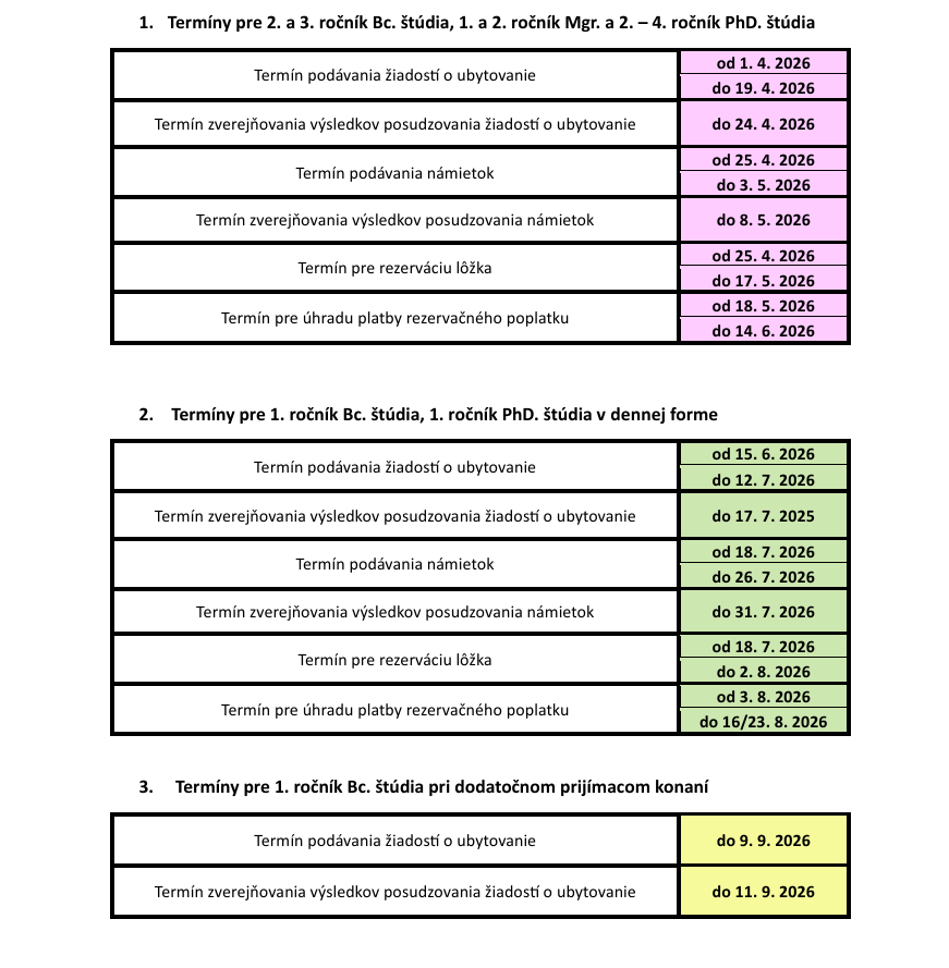 dávame do pozornosti termíny a informácie spojené s organizáciou ubytovania v akademickom roku 2026/2027.