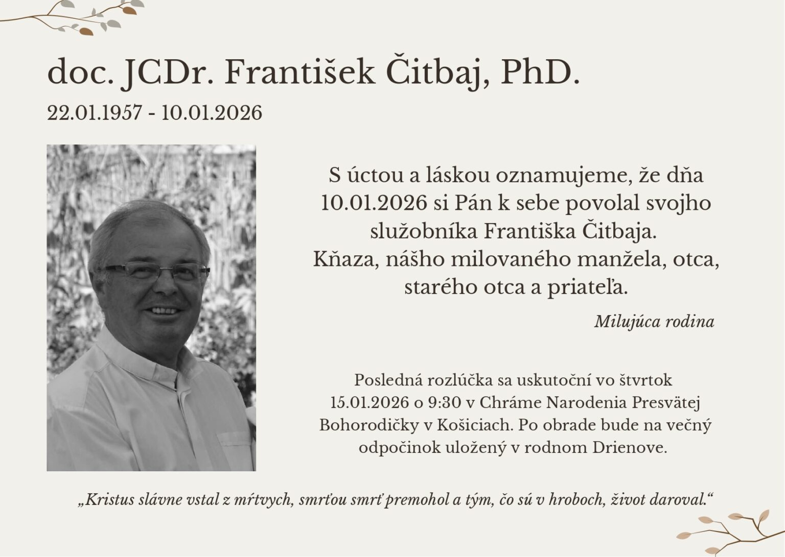 Do večnosti 10. januára odišiel gréckokatolícky kňaz, mitroforný protojerej, vysokoškolský pedagóg a odborník na kánonické právo doc. ICDr. František Čitbaj, PhD. Po desaťročia verne slúžil Cirkvi, veriacim Košickej eparchie i akademickej obci.