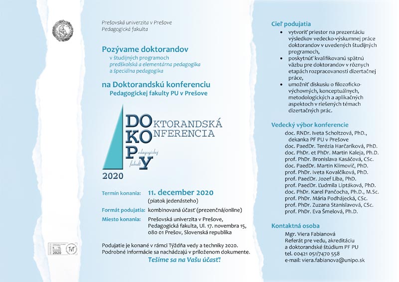 Doktorandská konferencia Pedagogickej fakulty PU (DOKOPY 2020) Program konferencie Abstrakty Zborník rozšírených abstraktov Aktualizoval(a): Peter Holdok, 16.12.2020