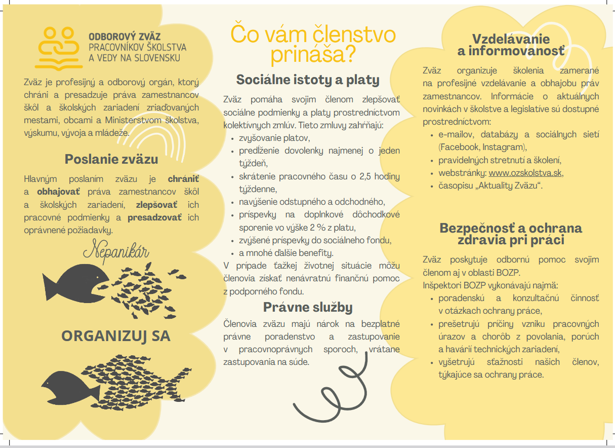 V Odborovom zväze pracovníkov školstva a vedy na Slovensku chránime, obhajujeme a presadzujeme záujmy svojich členov voči štátu. Sme živá a moderná organizácia, ktorú ako jedinú musia kompetentní vypočuť.