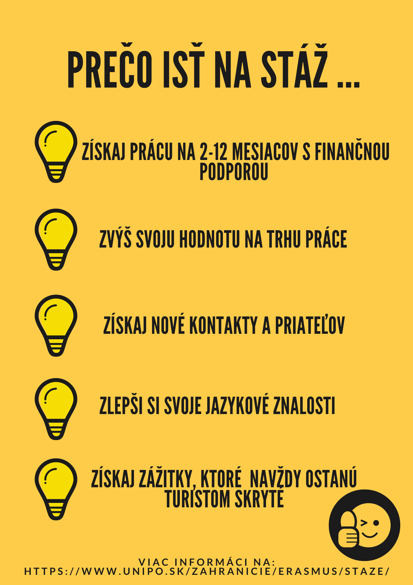 Chceš získať prácu svojich snov s kvalitným pracovným ohodnotením? Stáž ti pomôže uspieť! Dnešný pracovný trh čoraz intenzívnejšie vyžaduje skúsených absolventov, ktorí naberali prax už počas štúdia. Realizovaním stáže počas vysokoškolského štúdia nadobudneš požadované praktické skúsenosti v odbore v ktorom študuješ, rovnako aj sociálne zručnosti. Mysli na to že množstvo spoločností si svojich potencionálnych zamestnancov vyberá len na základe absolvovaných stáží, pretože neskúsený mladý človek pre nich nepredstavuje prínos.