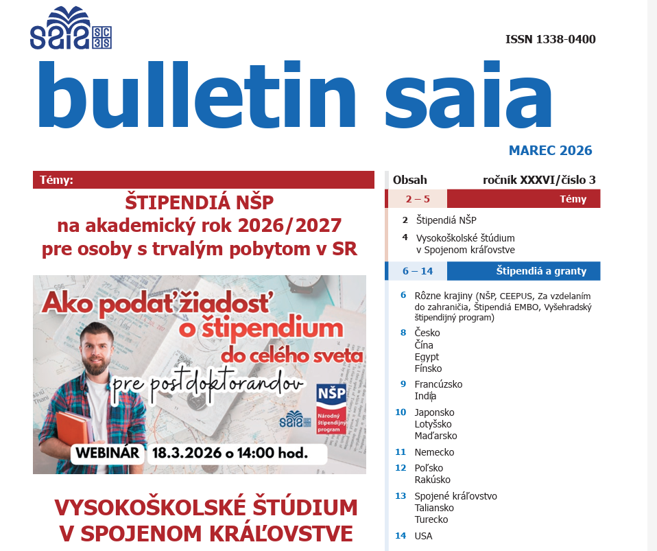 Na webovej stránke SAIA, n. o., www.saia.sk bolo zverejnené nové číslo Bulletinu SAIA, informačného mesačníka o štúdiu v zahraničí, štipendiách a grantoch a medzinárodnej spolupráci v oblasti